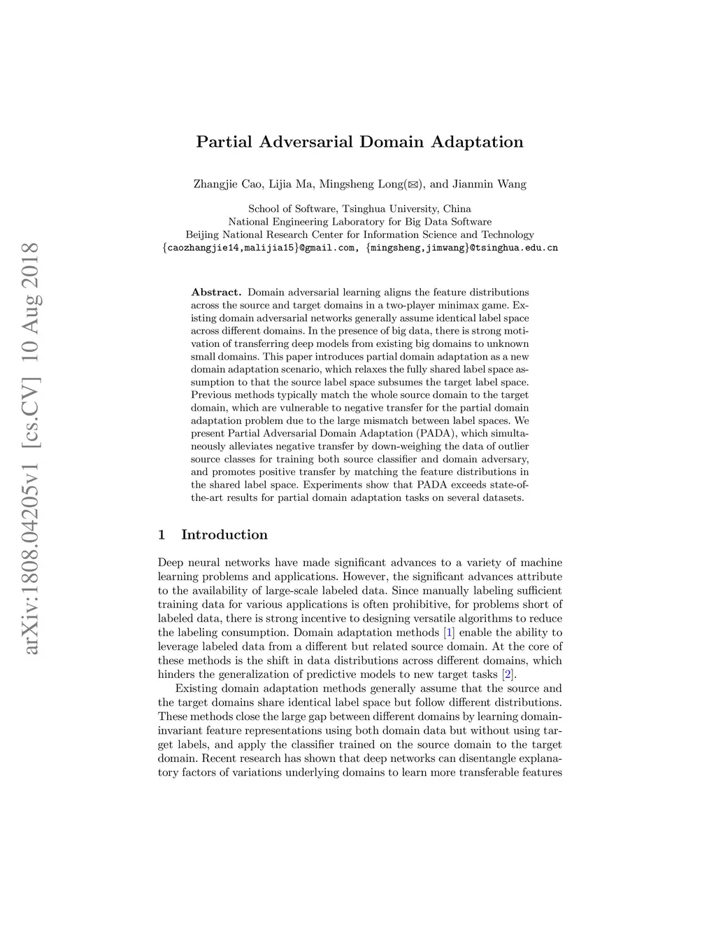 Domain adversarial learning aligns the feature distributions across the source and target domains in a two-player minimax game. Existing domain adversarial networks generally assume identical label space across different domains. In the presence of big data, there is strong motivation of transferring deep models from existing big domains to unknown small domains. This paper introduces partial domain adaptation as a new domain adaptation scenario, which relaxes the fully shared label space assumption to that the source label space subsumes the target label space. Previous methods typically match the whole source domain to the target domain, which are vulnerable to negative transfer for the partial domain adaptation problem due to the large mismatch between label spaces. We present Partial Adversarial Domain Adaptation (PADA), which simultaneously alleviates negative transfer by down-weighing the data of outlier source classes for training both source classifier and domain adversary, and promotes positive transfer by matching the feature distributions in the shared label space. Experiments show that PADA exceeds state-of-the-art results for partial domain adaptation tasks on several datasets.