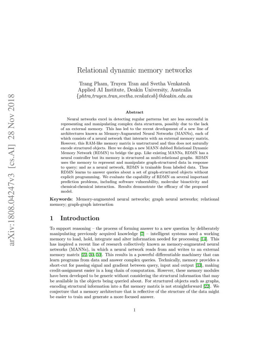 Neural networks excel in detecting regular patterns but are less successful in representing and manipulating complex data structures, possibly due to the lack of an external memory. This has led to the recent development of a new line of architectures known as Memory-Augmented Neural Networks (MANNs), each of which consists of a neural network that interacts with an external memory matrix. However, this RAM-like memory matrix is unstructured and thus does not naturally encode structured objects. Here we design a new MANN dubbed Relational Dynamic Memory Network (RMDN) to bridge the gap. Like existing MANNs, RMDN has a neural controller but its memory is structured as multi-relational graphs. RMDN uses the memory to represent and manipulate graph-structured data in response to query; and as a neural network, RMDN is trainable from labeled data. Thus RMDN learns to answer queries about a set of graph-structured objects without explicit programming. We evaluate the capability of RMDN on several important prediction problems, including software vulnerability, molecular bioactivity and chemical-chemical interaction. Results demonstrate the efficacy of the proposed model.