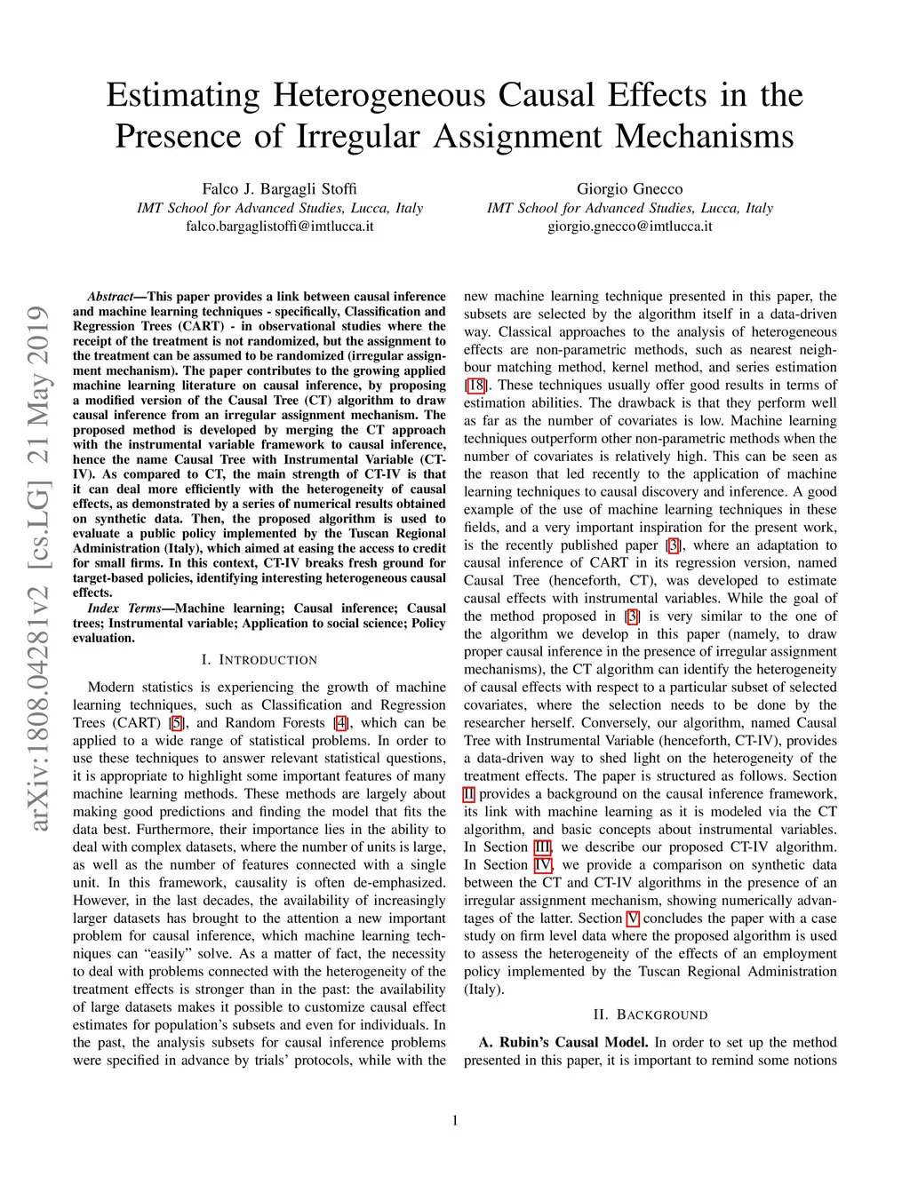 This paper provides a link between causal inference and machine learning techniques - specifically, Classification and Regression Trees (CART) - in observational studies where the receipt of the treatment is not randomized, but the assignment to the treatment can be assumed to be randomized (irregular assignment mechanism). The paper contributes to the growing applied machine learning literature on causal inference, by proposing a modified version of the Causal Tree (CT) algorithm to draw causal inference from an irregular assignment mechanism. The proposed method is developed by merging the CT approach with the instrumental variable framework to causal inference, hence the name Causal Tree with Instrumental Variable (CT-IV). As compared to CT, the main strength of CT-IV is that it can deal more efficiently with the heterogeneity of causal effects, as demonstrated by a series of numerical results obtained on synthetic data. Then, the proposed algorithm is used to evaluate a public policy implemented by the Tuscan Regional Administration (Italy), which aimed at easing the access to credit for small firms. In this context, CT-IV breaks fresh ground for target-based policies, identifying interesting heterogeneous causal effects.