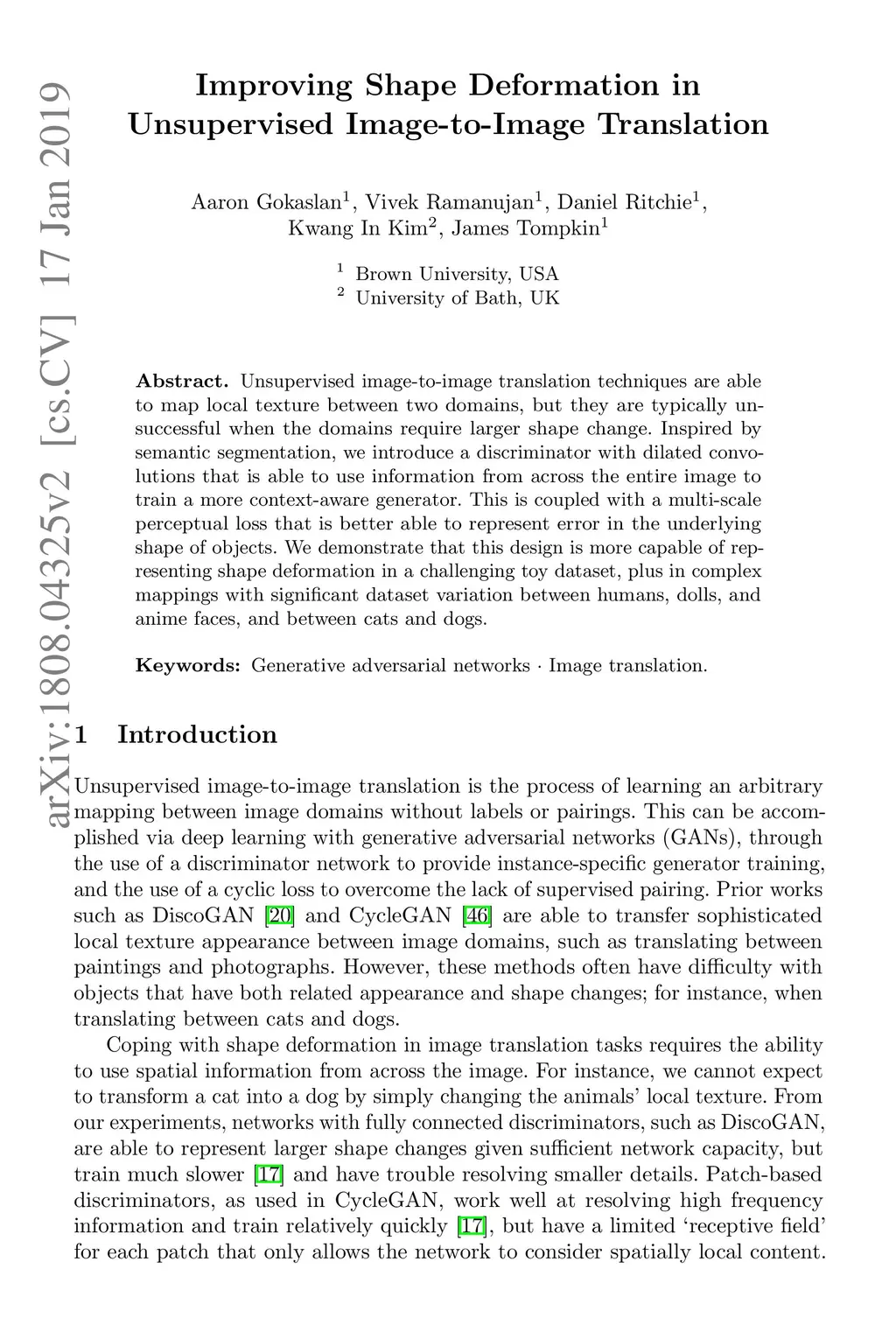 Unsupervised image-to-image translation techniques are able to map local texture between two domains, but they are typically unsuccessful when the domains require larger shape change. Inspired by semantic segmentation, we introduce a discriminator with dilated convolutions that is able to use information from across the entire image to train a more context-aware generator. This is coupled with a multi-scale perceptual loss that is better able to represent error in the underlying shape of objects. We demonstrate that this design is more capable of representing shape deformation in a challenging toy dataset, plus in complex mappings with significant dataset variation between humans, dolls, and anime faces, and between cats and dogs.