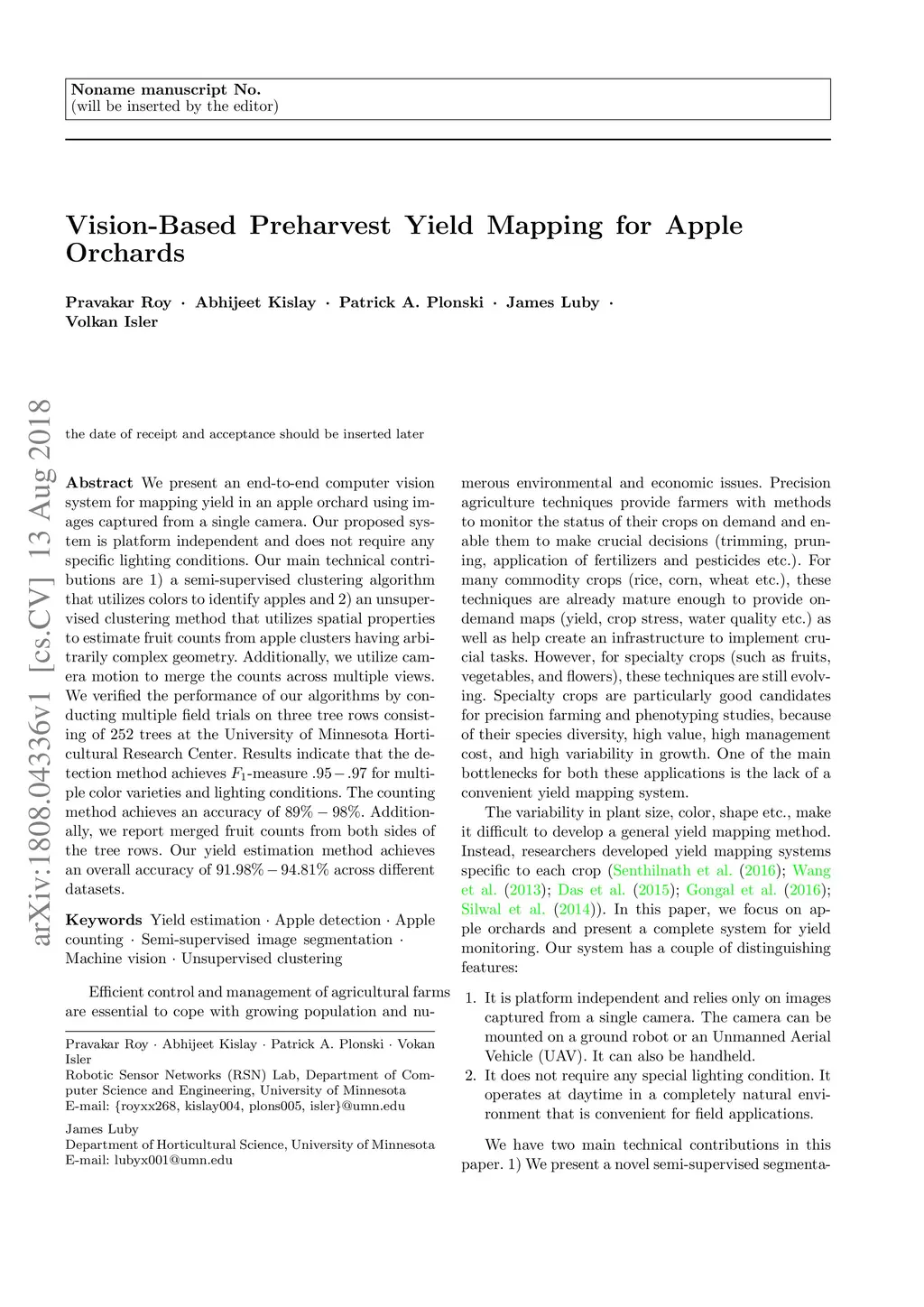 We present an end-to-end computer vision system for mapping yield in an apple orchard using images captured from a single camera. Our proposed system is platform independent and does not require any specific lighting conditions. Our main technical contributions are 1)~a semi-supervised clustering algorithm that utilizes colors to identify apples and 2)~an unsupervised clustering method that utilizes spatial properties to estimate fruit counts from apple clusters having arbitrarily complex geometry. Additionally, we utilize camera motion to merge the counts across multiple views. We verified the performance of our algorithms by conducting multiple field trials on three tree rows consisting of trees at the University of Minnesota Horticultural Research Center. Results indicate that the detection method achieves -measure for multiple color varieties and lighting conditions. The counting method achieves an accuracy of . Additionally, we report merged fruit counts from both sides of the tree rows. Our yield estimation method achieves an overall accuracy of across different datasets.
