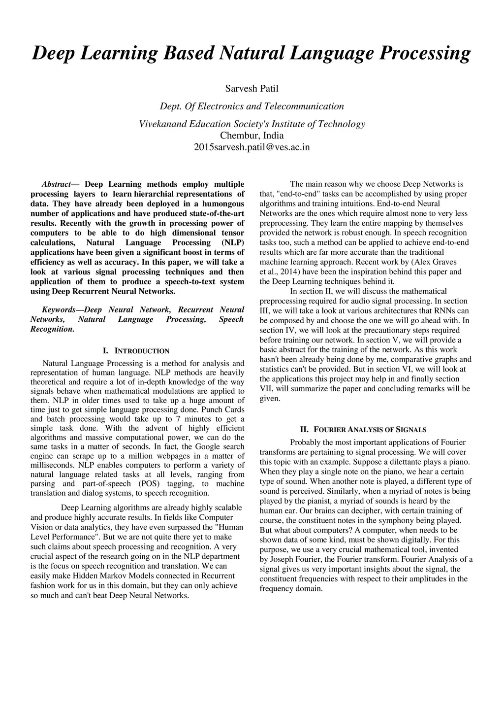 Deep Learning methods employ multiple processing layers to learn hierarchial representations of data. They have already been deployed in a humongous number of applications and have produced state-of-the-art results. Recently with the growth in processing power of computers to be able to do high dimensional tensor calculations, Natural Language Processing (NLP) applications have been given a significant boost in terms of efficiency as well as accuracy. In this paper, we will take a look at various signal processing techniques and then application of them to produce a speech-to-text system using Deep Recurrent Neural Networks.