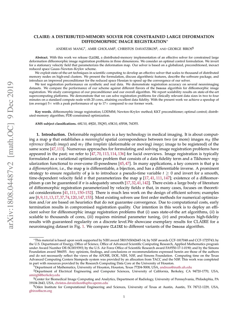 With this work, we release CLAIRE, a distributed-memory implementation of an effective solver for constrained large deformation diffeomorphic image registration problems in three dimensions. We consider an optimal control formulation. We invert for a stationary velocity field that parameterizes the deformation map. Our solver is based on a globalized, preconditioned, inexact reduced space Gauss--Newton--Krylov scheme. We exploit state-of-the-art techniques in scientific computing to develop an effective solver that scales to thousands of distributed memory nodes on high-end clusters. We present the formulation, discuss algorithmic features, describe the software package, and introduce an improved preconditioner for the reduced space Hessian to speed up the convergence of our solver. We test registration performance on synthetic and real data. We demonstrate registration accuracy on several neuroimaging datasets. We compare the performance of our scheme against different flavors of the Demons algorithm for diffeomorphic image registration. We study convergence of our preconditioner and our overall algorithm. We report scalability results on state-of-the-art supercomputing platforms. We demonstrate that we can solve registration problems for clinically relevant data sizes in two to four minutes on a standard compute node with 20 cores, attaining excellent data fidelity. With the present work we achieve a speedup of (on average) 5 with a peak performance of up to 17 compared to our former work.