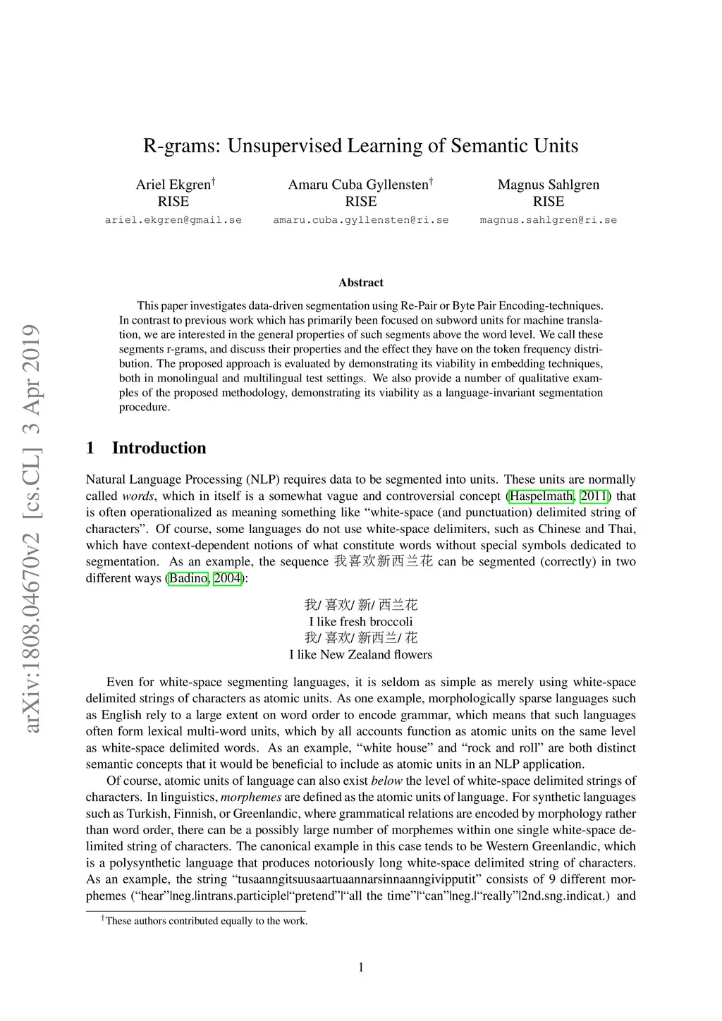 R-grams: Unsupervised Learning of Semantic Units in Natural Language