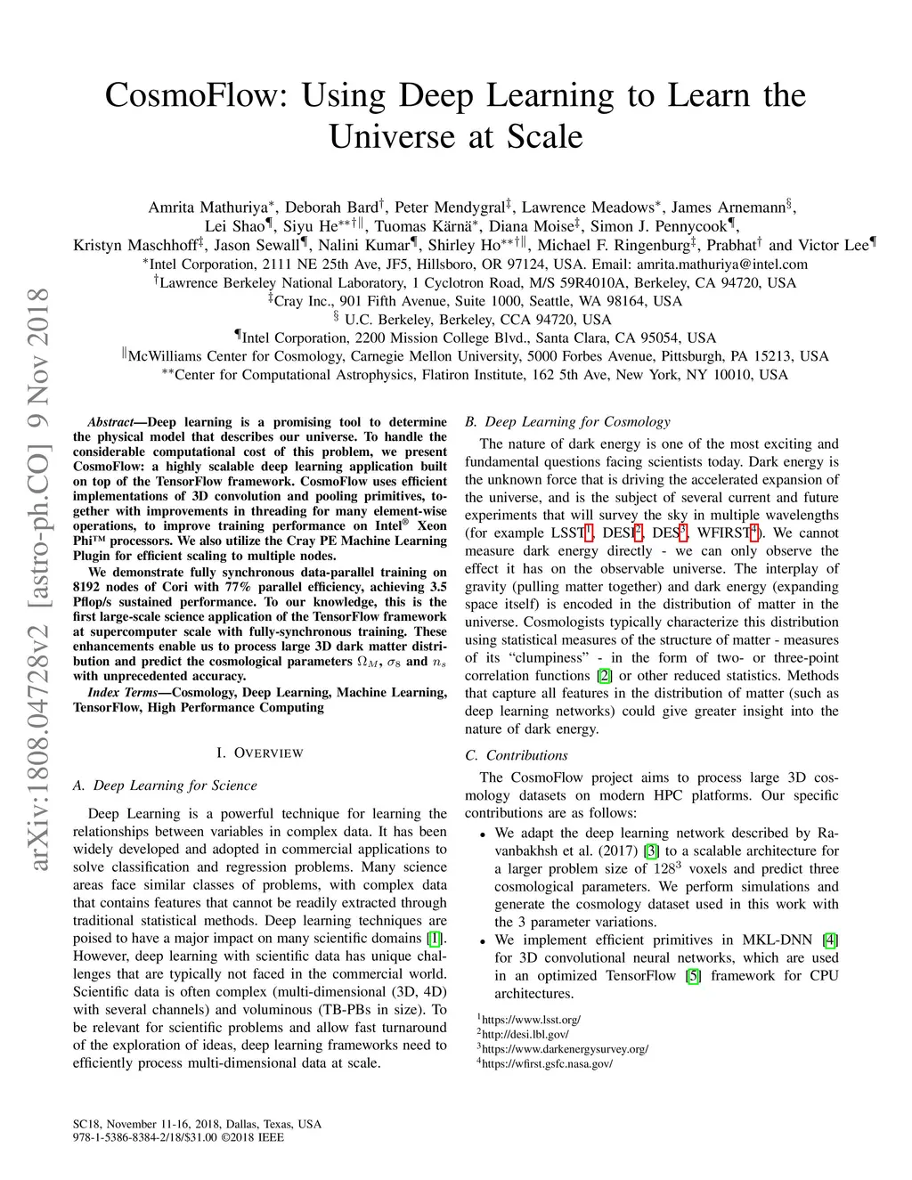 Deep learning is a promising tool to determine the physical model that describes our universe. To handle the considerable computational cost of this problem, we present CosmoFlow: a highly scalable deep learning application built on top of the TensorFlow framework. CosmoFlow uses efficient implementations of 3D convolution and pooling primitives, together with improvements in threading for many element-wise operations, to improve training performance on Intel(C) Xeon Phi(TM) processors. We also utilize the Cray PE Machine Learning Plugin for efficient scaling to multiple nodes. We demonstrate fully synchronous data-parallel training on 8192 nodes of Cori with 77% parallel efficiency, achieving 3.5 Pflop/s sustained performance. To our knowledge, this is the first large-scale science application of the TensorFlow framework at supercomputer scale with fully-synchronous training. These enhancements enable us to process large 3D dark matter distribution and predict the cosmological parameters , and n with unprecedented accuracy.