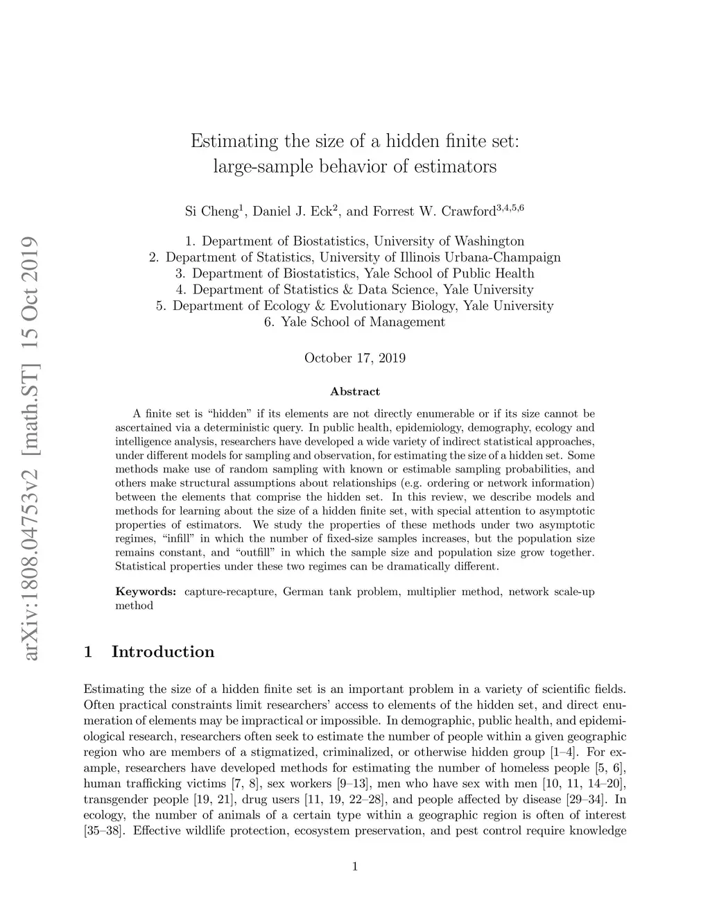 A finite set is "hidden" if its elements are not directly enumerable or if its size cannot be ascertained via a deterministic query. In public health, epidemiology, demography, ecology and intelligence analysis, researchers have developed a wide variety of indirect statistical approaches, under different models for sampling and observation, for estimating the size of a hidden set. Some methods make use of random sampling with known or estimable sampling probabilities, and others make structural assumptions about relationships (e.g. ordering or network information) between the elements that comprise the hidden set. In this review, we describe models and methods for learning about the size of a hidden finite set, with special attention to asymptotic properties of estimators. We study the properties of these methods under two asymptotic regimes, "infill" in which the number of fixed-size samples increases, but the population size remains constant, and "outfill" in which the sample size and population size grow together. Statistical properties under these two regimes can be dramatically different.