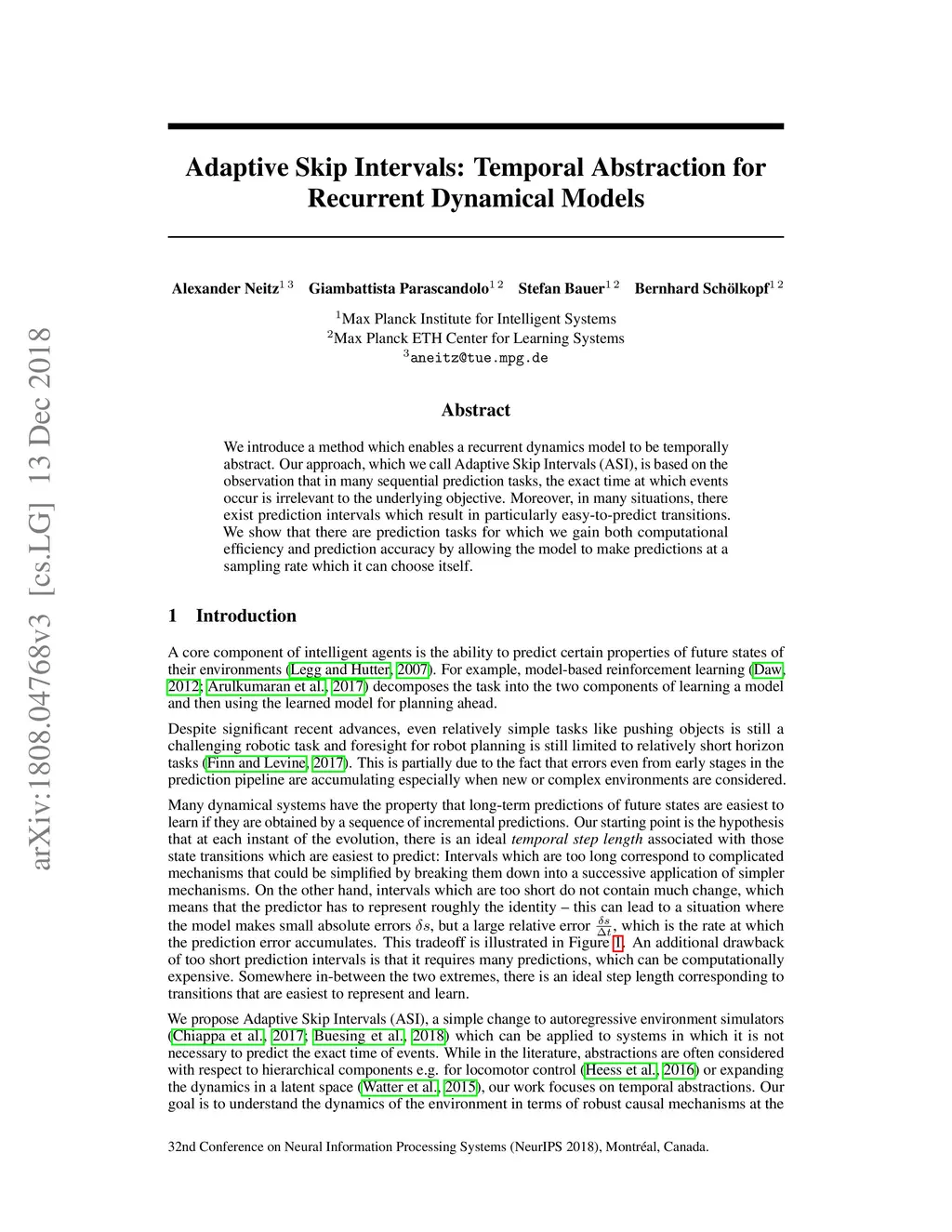 We introduce a method which enables a recurrent dynamics model to be temporally abstract. Our approach, which we call Adaptive Skip Intervals (ASI), is based on the observation that in many sequential prediction tasks, the exact time at which events occur is irrelevant to the underlying objective. Moreover, in many situations, there exist prediction intervals which result in particularly easy-to-predict transitions. We show that there are prediction tasks for which we gain both computational efficiency and prediction accuracy by allowing the model to make predictions at a sampling rate which it can choose itself.