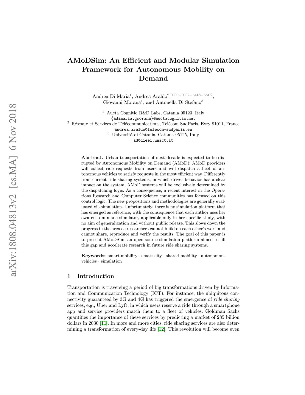 Urban transportation of next decade is expected to be disrupted by Autonomous Mobility on Demand (AMoD): AMoD providers will collect ride requests from users and will dispatch a fleet of autonomous vehicles to satisfy requests in the most efficient way. Differently from current ride sharing systems, in which driver behavior has a clear impact on the system, AMoD systems will be exclusively determined by the dispatching logic. As a consequence, a recent interest in the Operations Research and Computer Science communities has focused on this control logic. The new propositions and methodologies are generally evaluated via simulation. Unfortunately, there is no simulation platform that has emerged as reference, with the consequence that each author uses her own custom-made simulator, applicable only in her specific study, with no aim of generalization and without public release. This slows down the progress in the area as researchers cannot build on each other's work and cannot share, reproduce and verify the results. The goal of this paper is to present AMoDSim, an open-source simulation platform aimed to fill this gap and accelerate research in future ride sharing systems.