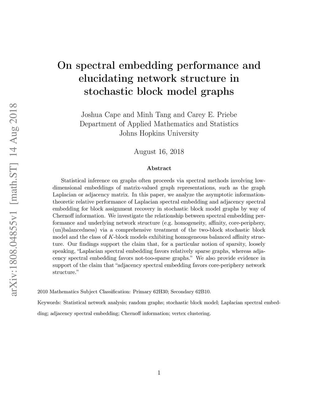 Statistical inference on graphs often proceeds via spectral methods involving low-dimensional embeddings of matrix-valued graph representations, such as the graph Laplacian or adjacency matrix. In this paper, we analyze the asymptotic information-theoretic relative performance of Laplacian spectral embedding and adjacency spectral embedding for block assignment recovery in stochastic block model graphs by way of Chernoff information. We investigate the relationship between spectral embedding performance and underlying network structure (e.g.~homogeneity, affinity, core-periphery, (un)balancedness) via a comprehensive treatment of the two-block stochastic block model and the class of -block models exhibiting homogeneous balanced affinity structure. Our findings support the claim that, for a particular notion of sparsity, loosely speaking, "Laplacian spectral embedding favors relatively sparse graphs, whereas adjacency spectral embedding favors not-too-sparse graphs." We also provide evidence in support of the claim that "adjacency spectral embedding favors core-periphery network structure."