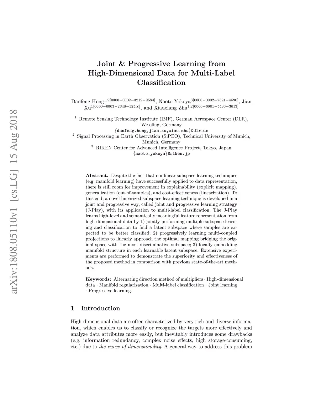 Despite the fact that nonlinear subspace learning techniques (e.g. manifold learning) have successfully applied to data representation, there is still room for improvement in explainability (explicit mapping), generalization (out-of-samples), and cost-effectiveness (linearization). To this end, a novel linearized subspace learning technique is developed in a joint and progressive way, called \textbf{j}oint and \textbf{p}rogressive \textbf{l}earning str\textbf{a}teg\textbf{y} (J-Play), with its application to multi-label classification. The J-Play learns high-level and semantically meaningful feature representation from high-dimensional data by 1) jointly performing multiple subspace learning and classification to find a latent subspace where samples are expected to be better classified; 2) progressively learning multi-coupled projections to linearly approach the optimal mapping bridging the original space with the most discriminative subspace; 3) locally embedding manifold structure in each learnable latent subspace. Extensive experiments are performed to demonstrate the superiority and effectiveness of the proposed method in comparison with previous state-of-the-art methods.