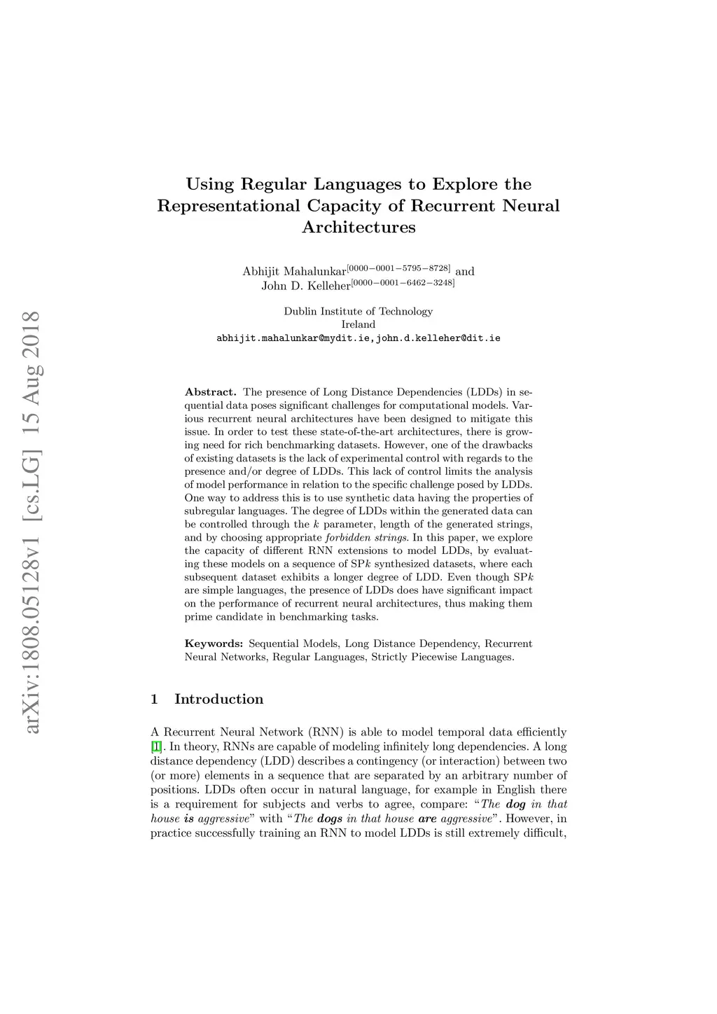 The presence of Long Distance Dependencies (LDDs) in sequential data poses significant challenges for computational models. Various recurrent neural architectures have been designed to mitigate this issue. In order to test these state-of-the-art architectures, there is growing need for rich benchmarking datasets. However, one of the drawbacks of existing datasets is the lack of experimental control with regards to the presence and/or degree of LDDs. This lack of control limits the analysis of model performance in relation to the specific challenge posed by LDDs. One way to address this is to use synthetic data having the properties of subregular languages. The degree of LDDs within the generated data can be controlled through the k parameter, length of the generated strings, and by choosing appropriate forbidden strings. In this paper, we explore the capacity of different RNN extensions to model LDDs, by evaluating these models on a sequence of SPk synthesized datasets, where each subsequent dataset exhibits a longer degree of LDD. Even though SPk are simple languages, the presence of LDDs does have significant impact on the performance of recurrent neural architectures, thus making them prime candidate in benchmarking tasks.
