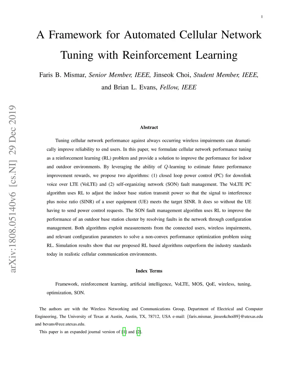 Tuning cellular network performance against always occurring wireless impairments can dramatically improve reliability to end users. In this paper, we formulate cellular network performance tuning as a reinforcement learning (RL) problem and provide a solution to improve the performance for indoor and outdoor environments. By leveraging the ability of Q-learning to estimate future performance improvement rewards, we propose two algorithms: (1) closed loop power control (PC) for downlink voice over LTE (VoLTE) and (2) self-organizing network (SON) fault management. The VoLTE PC algorithm uses RL to adjust the indoor base station transmit power so that the signal to interference plus noise ratio (SINR) of a user equipment (UE) meets the target SINR. It does so without the UE having to send power control requests. The SON fault management algorithm uses RL to improve the performance of an outdoor base station cluster by resolving faults in the network through configuration management. Both algorithms exploit measurements from the connected users, wireless impairments, and relevant configuration parameters to solve a non-convex performance optimization problem using RL. Simulation results show that our proposed RL based algorithms outperform the industry standards today in realistic cellular communication environments.