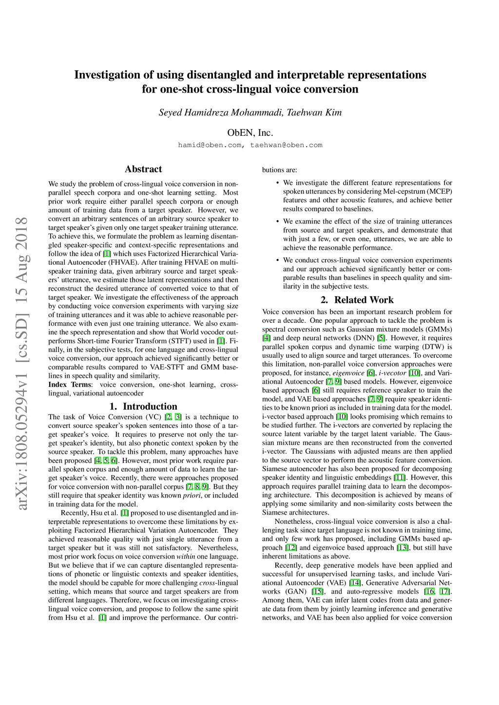 We study the problem of cross-lingual voice conversion in non-parallel speech corpora and one-shot learning setting. Most prior work require either parallel speech corpora or enough amount of training data from a target speaker. However, we convert an arbitrary sentences of an arbitrary source speaker to target speaker's given only one target speaker training utterance. To achieve this, we formulate the problem as learning disentangled speaker-specific and context-specific representations and follow the idea of [1] which uses Factorized Hierarchical Variational Autoencoder (FHVAE). After training FHVAE on multi-speaker training data, given arbitrary source and target speakers' utterance, we estimate those latent representations and then reconstruct the desired utterance of converted voice to that of target speaker. We investigate the effectiveness of the approach by conducting voice conversion experiments with varying size of training utterances and it was able to achieve reasonable performance with even just one training utterance. We also examine the speech representation and show that World vocoder outperforms Short-time Fourier Transform (STFT) used in [1]. Finally, in the subjective tests, for one language and cross-lingual voice conversion, our approach achieved significantly better or comparable results compared to VAE-STFT and GMM baselines in speech quality and similarity.