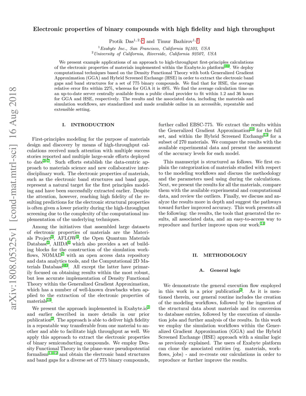 We present example applications of an approach to high-throughput first-principles calculations of the electronic properties of materials implemented within the Exabyte.io platform. We deploy computational techniques based on the Density Functional Theory with both Generalized Gradient Approximation (GGA) and Hybrid Screened Exchange (HSE) in order to extract the electronic band gaps and band structures for a set of 775 binary compounds. We find that for HSE, the average relative error fits within 22%, whereas for GGA it is 49%. We find the average calculation time on an up-to-date server centrally available from a public cloud provider to fit within 1.2 and 36 hours for GGA and HSE, respectively. The results and the associated data, including the materials and simulation workflows, are standardized and made available online in an accessible, repeatable and extensible setting.
