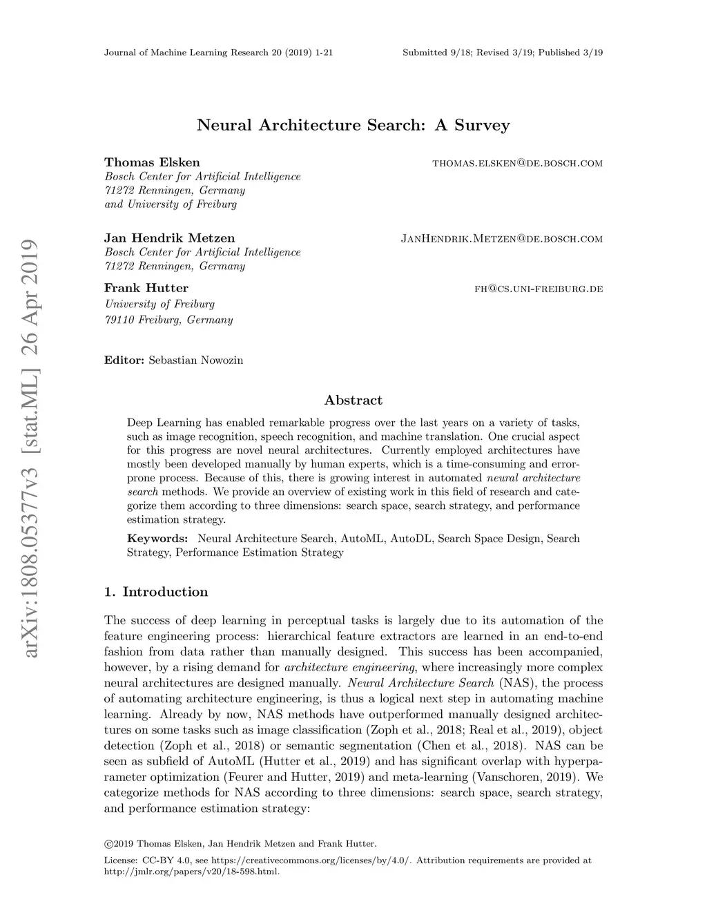 Deep Learning has enabled remarkable progress over the last years on a variety of tasks, such as image recognition, speech recognition, and machine translation. One crucial aspect for this progress are novel neural architectures. Currently employed architectures have mostly been developed manually by human experts, which is a time-consuming and error-prone process. Because of this, there is growing interest in automated neural architecture search methods. We provide an overview of existing work in this field of research and categorize them according to three dimensions: search space, search strategy, and performance estimation strategy.
