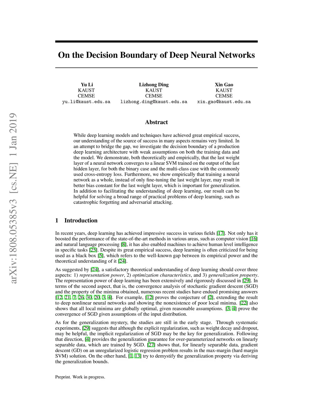 While deep learning models and techniques have achieved great empirical success, our understanding of the source of success in many aspects remains very limited. In an attempt to bridge the gap, we investigate the decision boundary of a production deep learning architecture with weak assumptions on both the training data and the model. We demonstrate, both theoretically and empirically, that the last weight layer of a neural network converges to a linear SVM trained on the output of the last hidden layer, for both the binary case and the multi-class case with the commonly used cross-entropy loss. Furthermore, we show empirically that training a neural network as a whole, instead of only fine-tuning the last weight layer, may result in better bias constant for the last weight layer, which is important for generalization. In addition to facilitating the understanding of deep learning, our result can be helpful for solving a broad range of practical problems of deep learning, such as catastrophic forgetting and adversarial attacking. The experiment codes are available at https://github.com/lykaust15/NN_decision_boundary