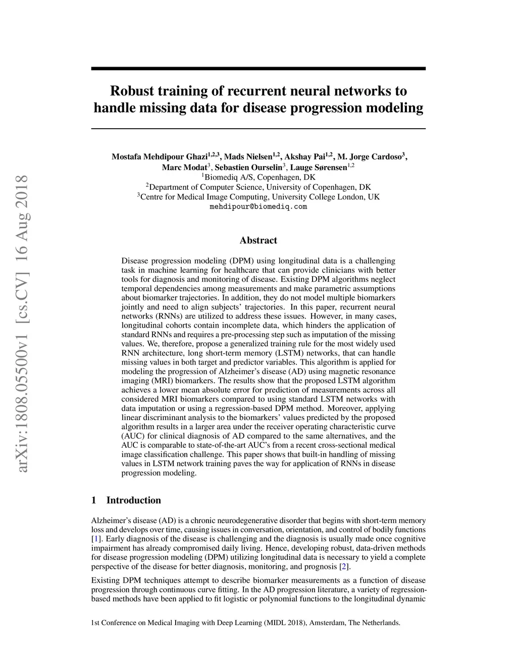 Disease progression modeling (DPM) using longitudinal data is a challenging task in machine learning for healthcare that can provide clinicians with better tools for diagnosis and monitoring of disease. Existing DPM algorithms neglect temporal dependencies among measurements and make parametric assumptions about biomarker trajectories. In addition, they do not model multiple biomarkers jointly and need to align subjects' trajectories. In this paper, recurrent neural networks (RNNs) are utilized to address these issues. However, in many cases, longitudinal cohorts contain incomplete data, which hinders the application of standard RNNs and requires a pre-processing step such as imputation of the missing values. We, therefore, propose a generalized training rule for the most widely used RNN architecture, long short-term memory (LSTM) networks, that can handle missing values in both target and predictor variables. This algorithm is applied for modeling the progression of Alzheimer's disease (AD) using magnetic resonance imaging (MRI) biomarkers. The results show that the proposed LSTM algorithm achieves a lower mean absolute error for prediction of measurements across all considered MRI biomarkers compared to using standard LSTM networks with data imputation or using a regression-based DPM method. Moreover, applying linear discriminant analysis to the biomarkers' values predicted by the proposed algorithm results in a larger area under the receiver operating characteristic curve (AUC) for clinical diagnosis of AD compared to the same alternatives, and the AUC is comparable to state-of-the-art AUCs from a recent cross-sectional medical image classification challenge. This paper shows that built-in handling of missing values in LSTM network training paves the way for application of RNNs in disease progression modeling.