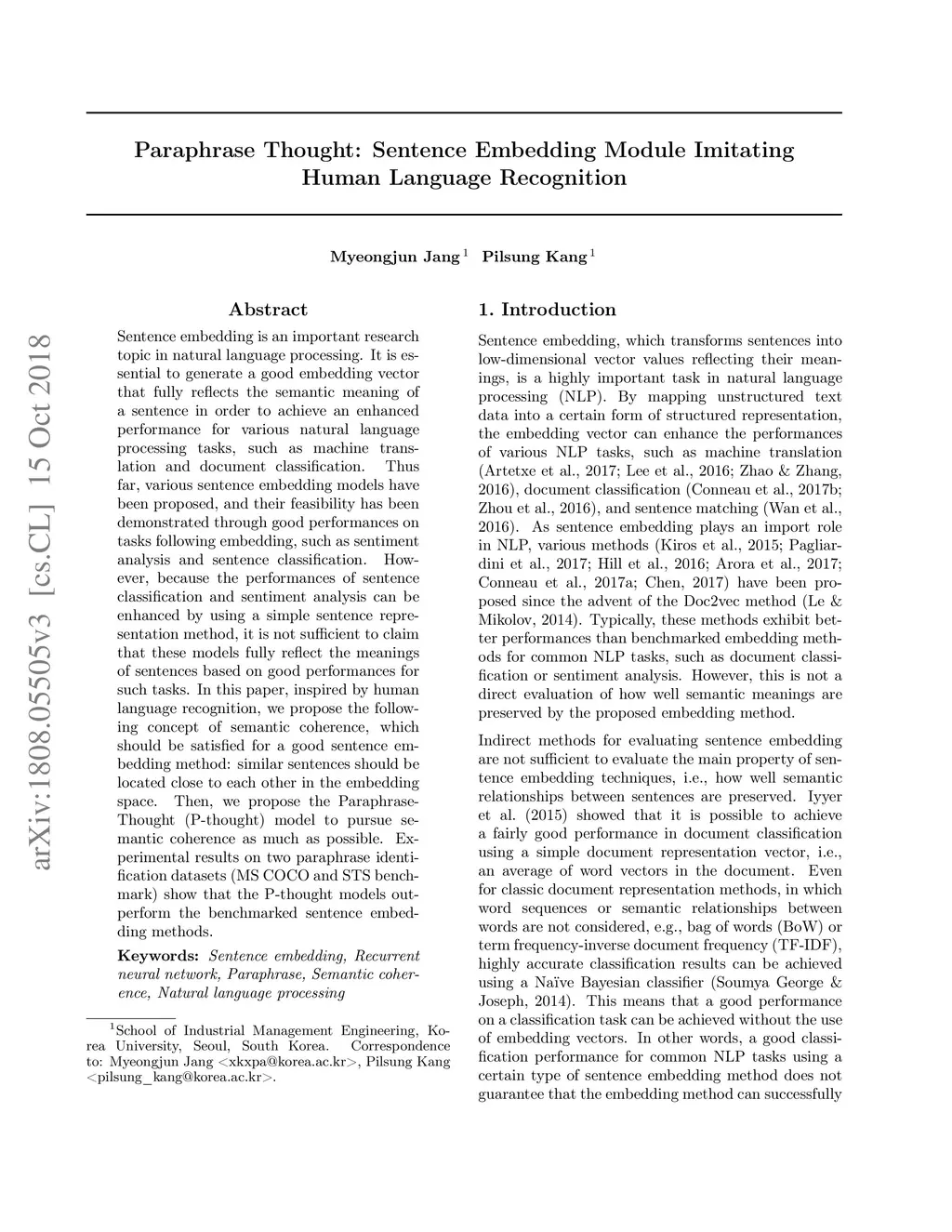 Sentence embedding is an important research topic in natural language processing. It is essential to generate a good embedding vector that fully reflects the semantic meaning of a sentence in order to achieve an enhanced performance for various natural language processing tasks, such as machine translation and document classification. Thus far, various sentence embedding models have been proposed, and their feasibility has been demonstrated through good performances on tasks following embedding, such as sentiment analysis and sentence classification. However, because the performances of sentence classification and sentiment analysis can be enhanced by using a simple sentence representation method, it is not sufficient to claim that these models fully reflect the meanings of sentences based on good performances for such tasks. In this paper, inspired by human language recognition, we propose the following concept of semantic coherence, which should be satisfied for a good sentence embedding method: similar sentences should be located close to each other in the embedding space. Then, we propose the Paraphrase-Thought (P-thought) model to pursue semantic coherence as much as possible. Experimental results on two paraphrase identification datasets (MS COCO and STS benchmark) show that the P-thought models outperform the benchmarked sentence embedding methods.