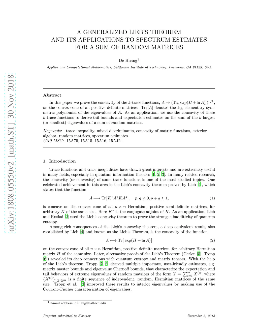 In this paper we prove the concavity of the -trace functions, , on the convex cone of all positive definite matrices. denotes the elementary symmetric polynomial of the eigenvalues of . As an application, we use the concavity of these -trace functions to derive tail bounds and expectation estimates on the sum of the largest (or smallest) eigenvalues of a sum of random matrices.