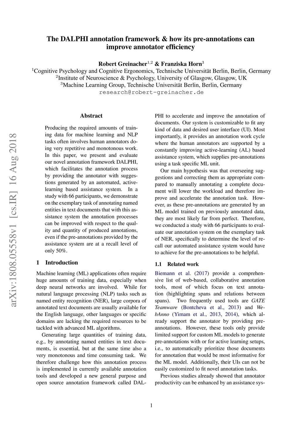 Producing the required amounts of training data for machine learning and NLP tasks often involves human annotators doing very repetitive and monotonous work. In this paper, we present and evaluate our novel annotation framework DALPHI, which facilitates the annotation process by providing the annotator with suggestions generated by an automated, active-learning based assistance system. In a study with 66 participants, we demonstrate on the exemplary task of annotating named entities in text documents that with this assistance system the annotation processes can be improved with respect to the quality and quantity of produced annotations, even if the pre-annotations provided by the assistance system are at a recall level of only 50%.