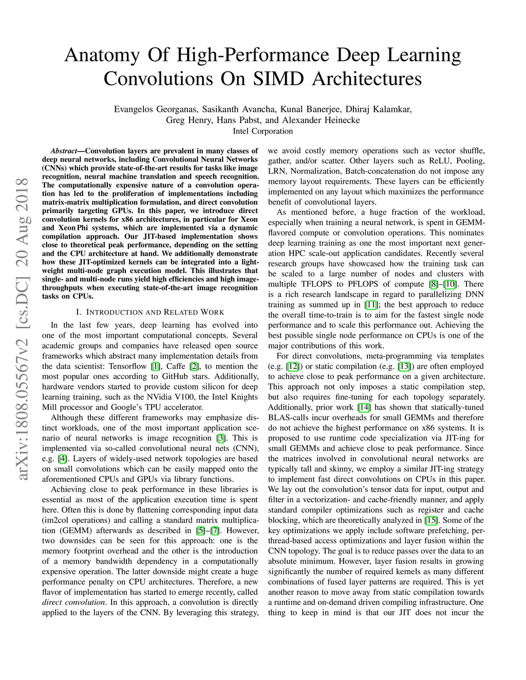 Convolution layers are prevalent in many classes of deep neural networks, including Convolutional Neural Networks (CNNs) which provide state-of-the-art results for tasks like image recognition, neural machine translation and speech recognition. The computationally expensive nature of a convolution operation has led to the proliferation of implementations including matrix-matrix multiplication formulation, and direct convolution primarily targeting GPUs. In this paper, we introduce direct convolution kernels for x86 architectures, in particular for Xeon and XeonPhi systems, which are implemented via a dynamic compilation approach. Our JIT-based implementation shows close to theoretical peak performance, depending on the setting and the CPU architecture at hand. We additionally demonstrate how these JIT-optimized kernels can be integrated into a lightweight multi-node graph execution model. This illustrates that single- and multi-node runs yield high efficiencies and high image-throughputs when executing state-of-the-art image recognition tasks on CPUs.