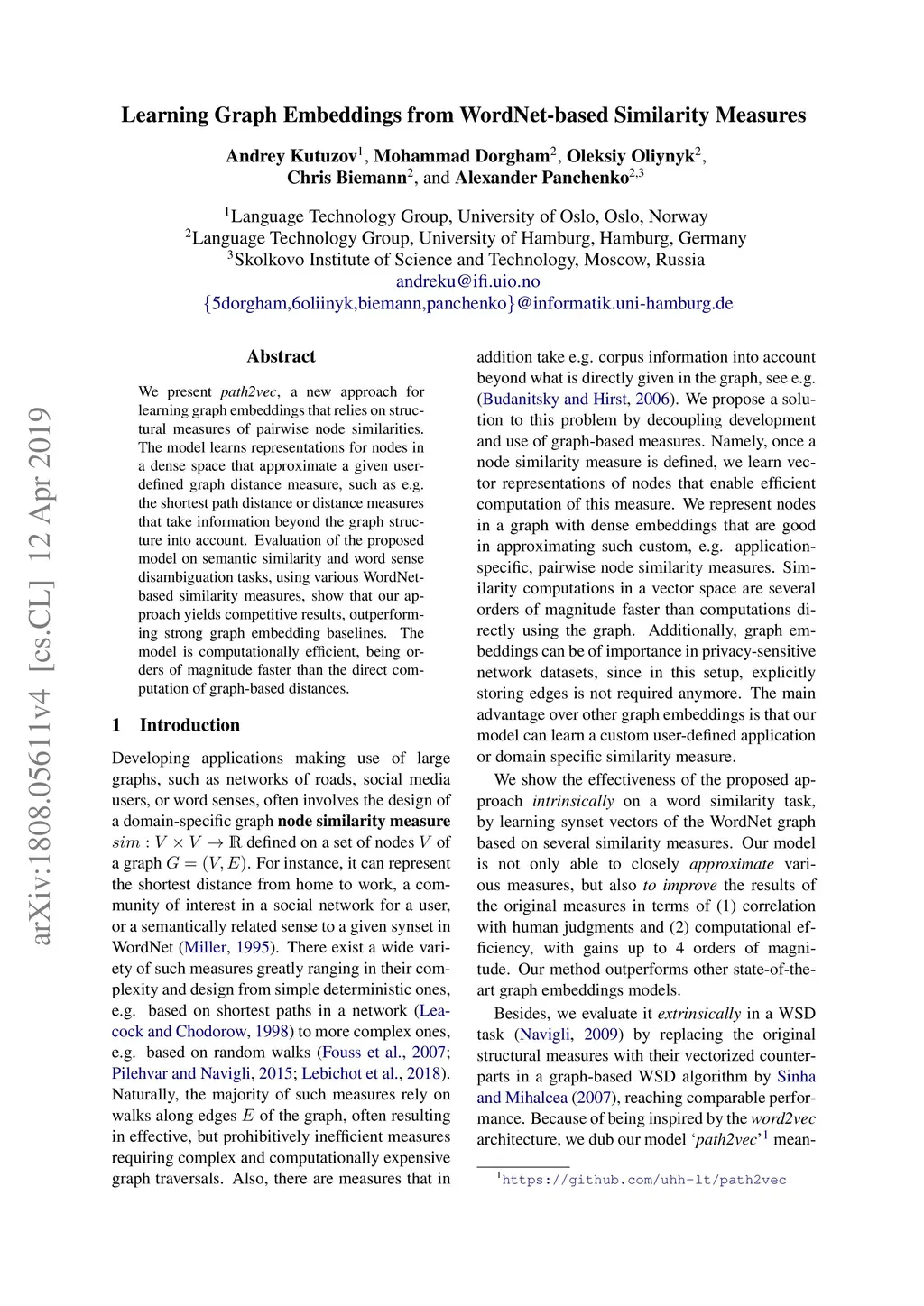 We present path2vec, a new approach for learning graph embeddings that relies on structural measures of pairwise node similarities. The model learns representations for nodes in a dense space that approximate a given user-defined graph distance measure, such as e.g. the shortest path distance or distance measures that take information beyond the graph structure into account. Evaluation of the proposed model on semantic similarity and word sense disambiguation tasks, using various WordNet-based similarity measures, show that our approach yields competitive results, outperforming strong graph embedding baselines. The model is computationally efficient, being orders of magnitude faster than the direct computation of graph-based distances.