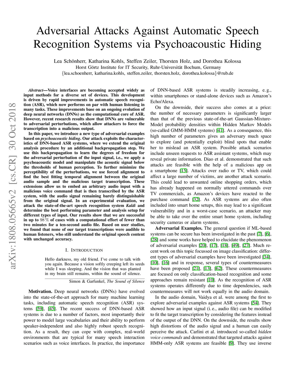 Voice interfaces are becoming accepted widely as input methods for a diverse set of devices. This development is driven by rapid improvements in automatic speech recognition (ASR), which now performs on par with human listening in many tasks. These improvements base on an ongoing evolution of DNNs as the computational core of ASR. However, recent research results show that DNNs are vulnerable to adversarial perturbations, which allow attackers to force the transcription into a malicious output. In this paper, we introduce a new type of adversarial examples based on psychoacoustic hiding. Our attack exploits the characteristics of DNN-based ASR systems, where we extend the original analysis procedure by an additional backpropagation step. We use this backpropagation to learn the degrees of freedom for the adversarial perturbation of the input signal, i.e., we apply a psychoacoustic model and manipulate the acoustic signal below the thresholds of human perception. To further minimize the perceptibility of the perturbations, we use forced alignment to find the best fitting temporal alignment between the original audio sample and the malicious target transcription. These extensions allow us to embed an arbitrary audio input with a malicious voice command that is then transcribed by the ASR system, with the audio signal remaining barely distinguishable from the original signal. In an experimental evaluation, we attack the state-of-the-art speech recognition system Kaldi and determine the best performing parameter and analysis setup for different types of input. Our results show that we are successful in up to 98% of cases with a computational effort of fewer than two minutes for a ten-second audio file. Based on user studies, we found that none of our target transcriptions were audible to human listeners, who still understand the original speech content with unchanged accuracy.