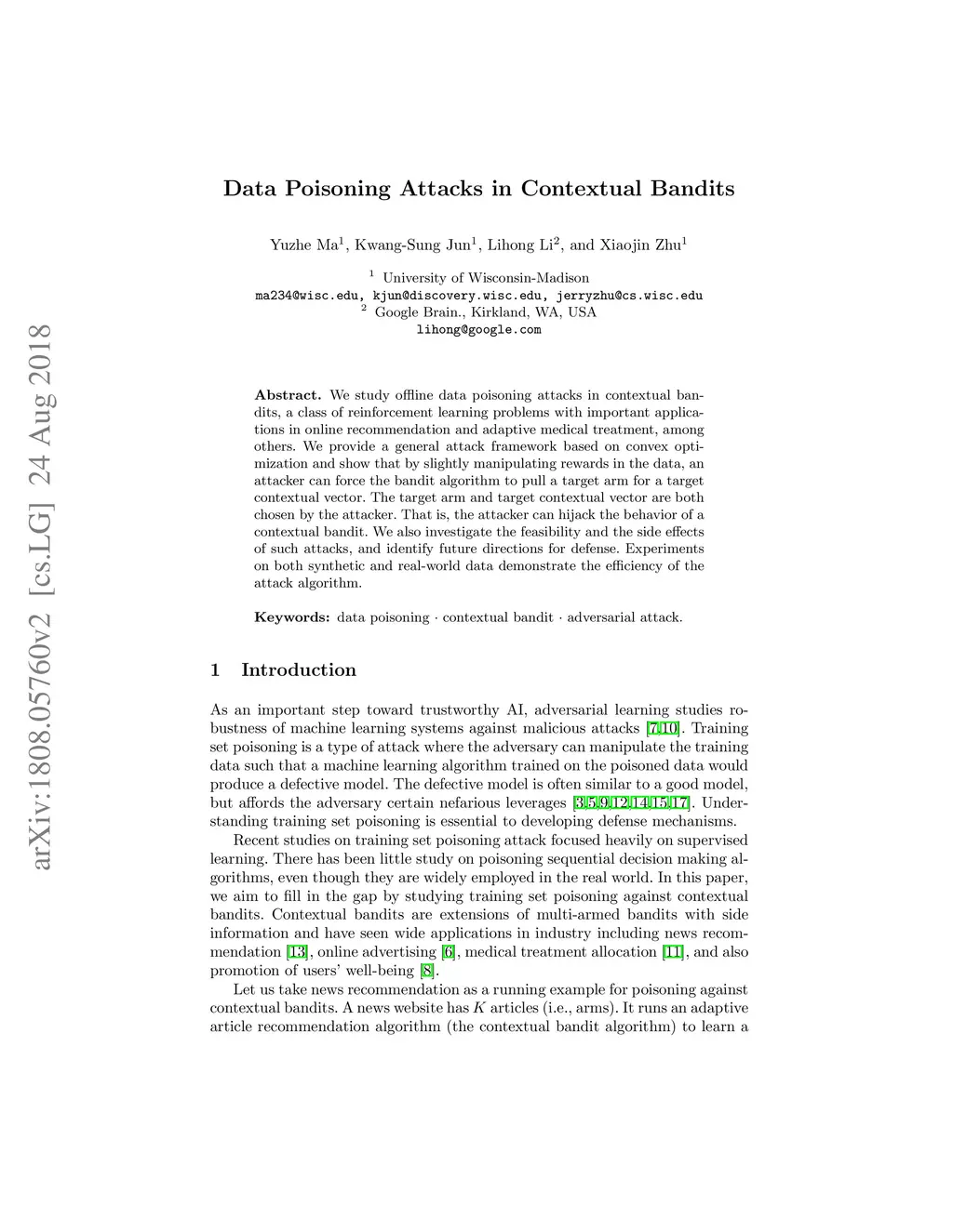 We study offline data poisoning attacks in contextual bandits, a class of reinforcement learning problems with important applications in online recommendation and adaptive medical treatment, among others. We provide a general attack framework based on convex optimization and show that by slightly manipulating rewards in the data, an attacker can force the bandit algorithm to pull a target arm for a target contextual vector. The target arm and target contextual vector are both chosen by the attacker. That is, the attacker can hijack the behavior of a contextual bandit. We also investigate the feasibility and the side effects of such attacks, and identify future directions for defense. Experiments on both synthetic and real-world data demonstrate the efficiency of the attack algorithm.