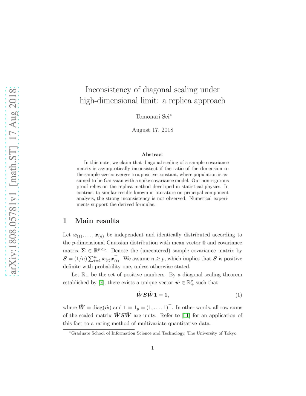 In this note, we claim that diagonal scaling of a sample covariance matrix is asymptotically inconsistent if the ratio of the dimension to the sample size converges to a positive constant, where population is assumed to be Gaussian with a spike covariance model. Our non-rigorous proof relies on the replica method developed in statistical physics. In contrast to similar results known in literature on principal component analysis, the strong inconsistency is not observed. Numerical experiments support the derived formulas.