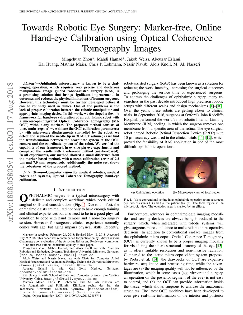 Towards Robotic Eye Surgery: Marker-free, Online Hand-eye Calibration