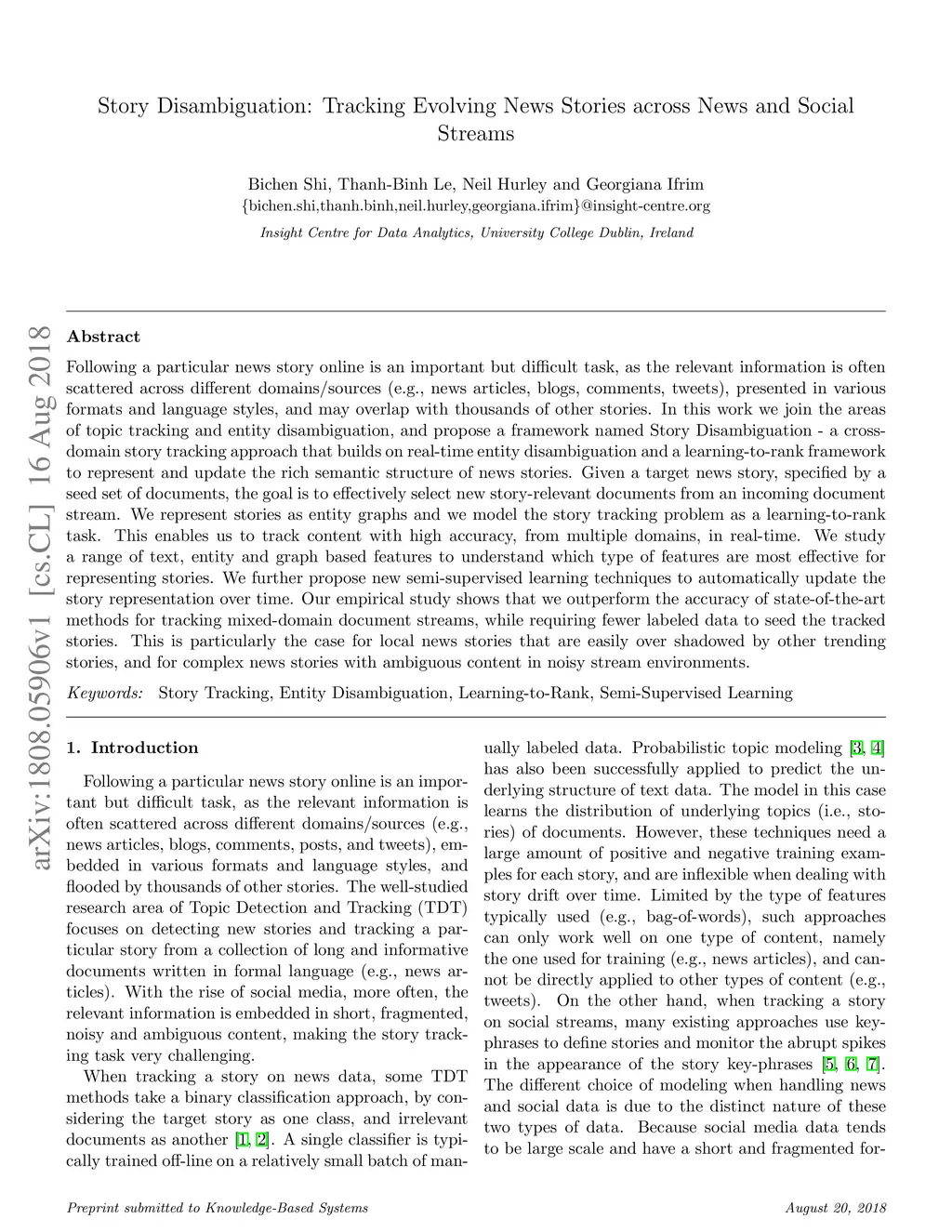 Following a particular news story online is an important but difficult task, as the relevant information is often scattered across different domains/sources (e.g., news articles, blogs, comments, tweets), presented in various formats and language styles, and may overlap with thousands of other stories. In this work we join the areas of topic tracking and entity disambiguation, and propose a framework named Story Disambiguation - a cross-domain story tracking approach that builds on real-time entity disambiguation and a learning-to-rank framework to represent and update the rich semantic structure of news stories. Given a target news story, specified by a seed set of documents, the goal is to effectively select new story-relevant documents from an incoming document stream. We represent stories as entity graphs and we model the story tracking problem as a learning-to-rank task. This enables us to track content with high accuracy, from multiple domains, in real-time. We study a range of text, entity and graph based features to understand which type of features are most effective for representing stories. We further propose new semi-supervised learning techniques to automatically update the story representation over time. Our empirical study shows that we outperform the accuracy of state-of-the-art methods for tracking mixed-domain document streams, while requiring fewer labeled data to seed the tracked stories. This is particularly the case for local news stories that are easily over shadowed by other trending stories, and for complex news stories with ambiguous content in noisy stream environments.