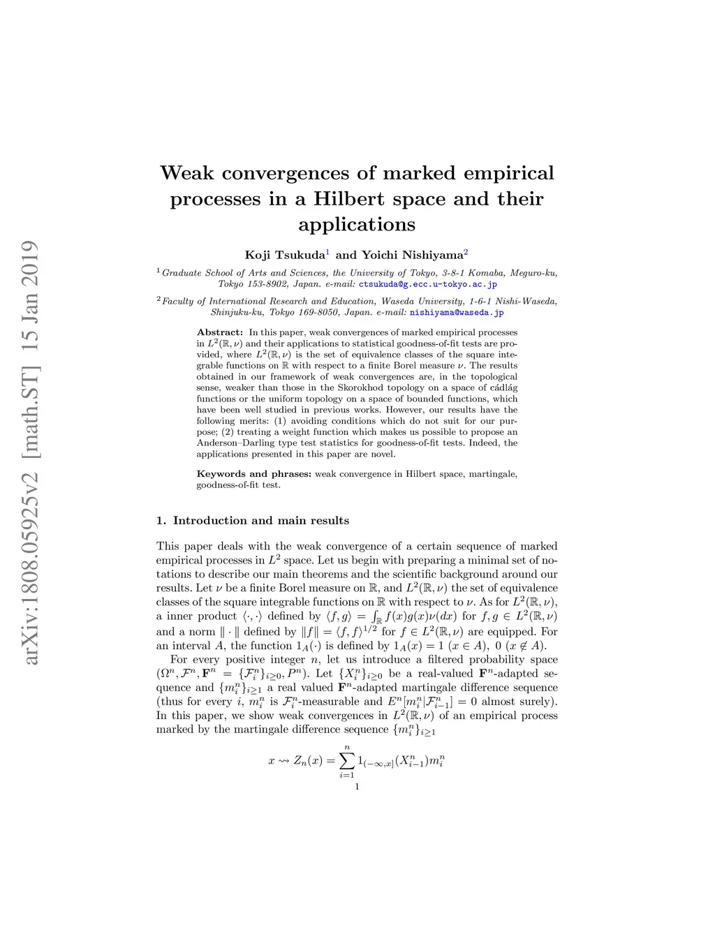 In this paper, weak convergences of marked empirical processes in and their applications to statistical goodness-of-fit tests are provided, where is the set of equivalence classes of the square integrable functions on with respect to a finite Borel measure . The results obtained in our framework of weak convergences are, in the topological sense, weaker than those in the Skorokhod topology on a space of c\ádl\ág functions or the uniform topology on a space of bounded functions, which have been well studied in previous works. However, our results have the following merits: (1) avoiding conditions which do not suit for our purpose; (2) treating a weight function which makes us possible to propose an Anderson--Darling type test statistics for goodness-of-fit tests. Indeed, the applications presented in this paper are novel.