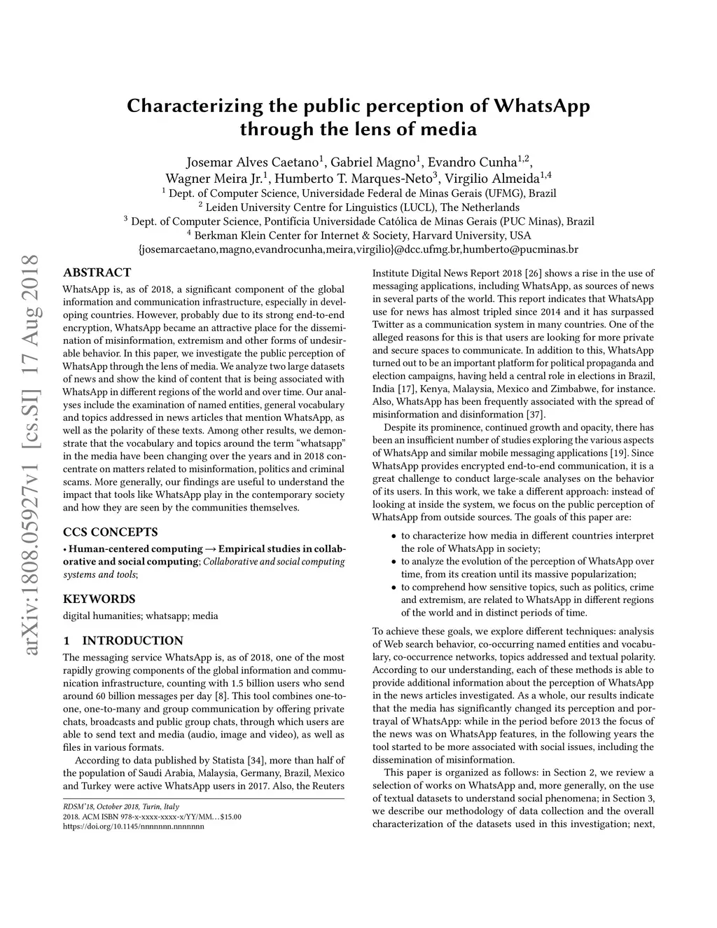 WhatsApp is, as of 2018, a significant component of the global information and communication infrastructure, especially in developing countries. However, probably due to its strong end-to-end encryption, WhatsApp became an attractive place for the dissemination of misinformation, extremism and other forms of undesirable behavior. In this paper, we investigate the public perception of WhatsApp through the lens of media. We analyze two large datasets of news and show the kind of content that is being associated with WhatsApp in different regions of the world and over time. Our analyses include the examination of named entities, general vocabulary, and topics addressed in news articles that mention WhatsApp, as well as the polarity of these texts. Among other results, we demonstrate that the vocabulary and topics around the term "whatsapp" in the media have been changing over the years and in 2018 concentrate on matters related to misinformation, politics and criminal scams. More generally, our findings are useful to understand the impact that tools like WhatsApp play in the contemporary society and how they are seen by the communities themselves.