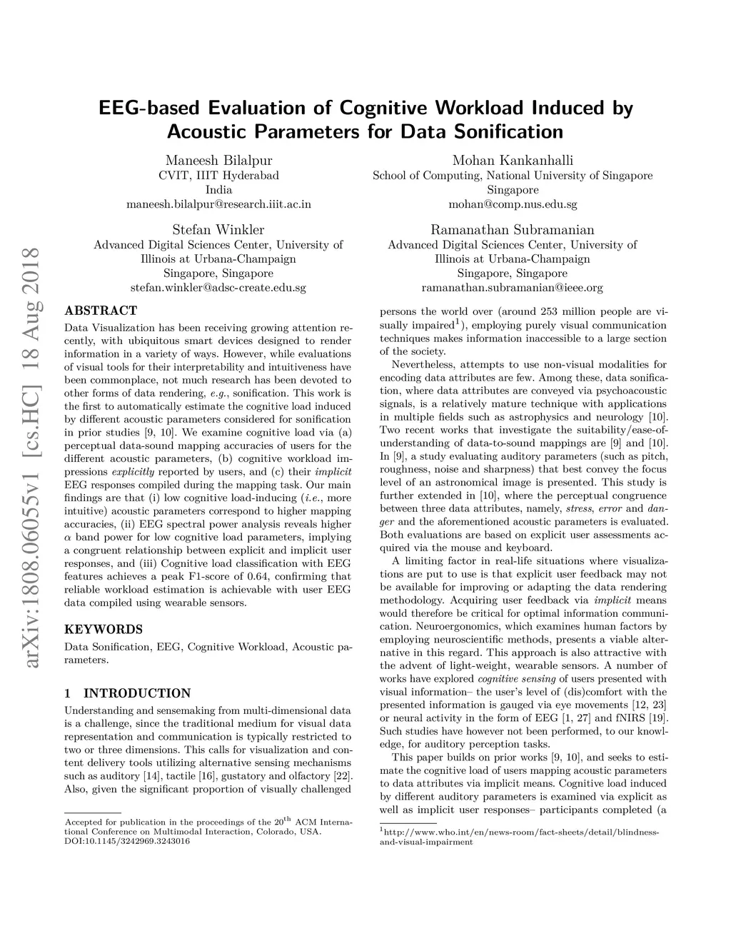 Data Visualization has been receiving growing attention recently, with ubiquitous smart devices designed to render information in a variety of ways. However, while evaluations of visual tools for their interpretability and intuitiveness have been commonplace, not much research has been devoted to other forms of data rendering, eg, sonification. This work is the first to automatically estimate the cognitive load induced by different acoustic parameters considered for sonification in prior studies. We examine cognitive load via (a) perceptual data-sound mapping accuracies of users for the different acoustic parameters, (b) cognitive workload impressions explicitly reported by users, and (c) their implicit EEG responses compiled during the mapping task. Our main findings are that (i) low cognitive load-inducing (ie, more intuitive) acoustic parameters correspond to higher mapping accuracies, (ii) EEG spectral power analysis reveals higher band power for low cognitive load parameters, implying a congruent relationship between explicit and implicit user responses, and (iii) Cognitive load classification with EEG features achieves a peak F1-score of 0.64, confirming that reliable workload estimation is achievable with user EEG data compiled using wearable sensors.