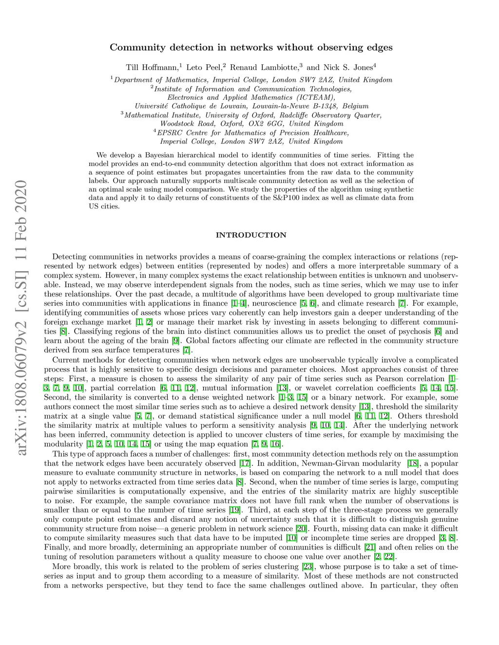 We develop a Bayesian hierarchical model to identify communities in networks for which we do not observe the edges directly, but instead observe a series of interdependent signals for each of the nodes. Fitting the model provides an end-to-end community detection algorithm that does not extract information as a sequence of point estimates but propagates uncertainties from the raw data to the community labels. Our approach naturally supports multiscale community detection as well as the selection of an optimal scale using model comparison. We study the properties of the algorithm using synthetic data and apply it to daily returns of constituents of the S&P100 index as well as climate data from US cities.