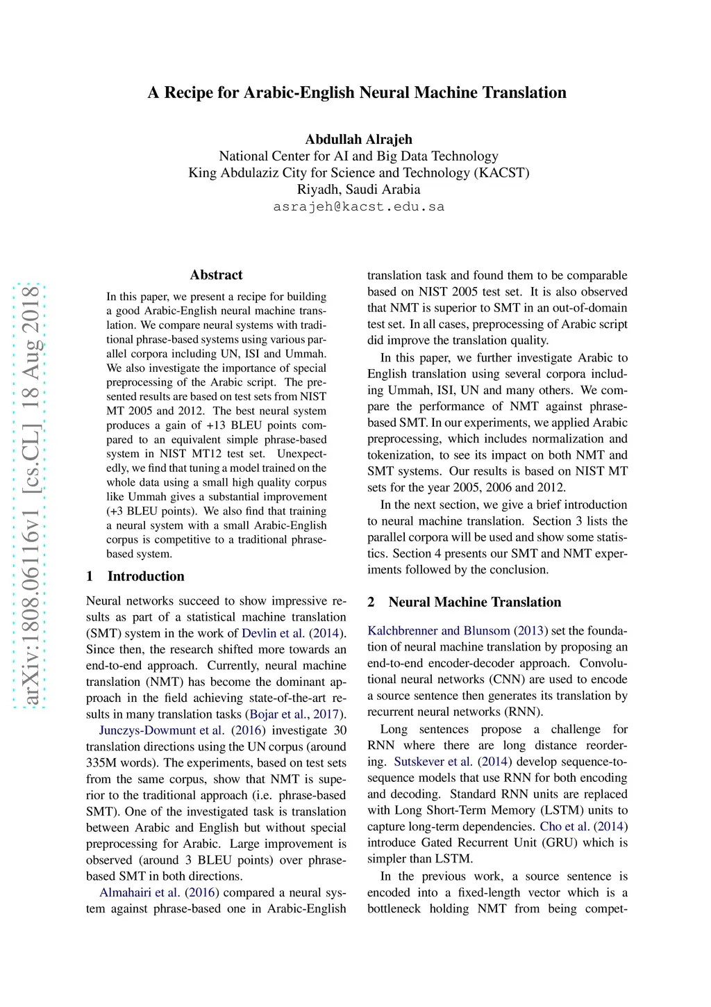 In this paper, we present a recipe for building a good Arabic-English neural machine translation. We compare neural systems with traditional phrase-based systems using various parallel corpora including UN, ISI and Ummah. We also investigate the importance of special preprocessing of the Arabic script. The presented results are based on test sets from NIST MT 2005 and 2012. The best neural system produces a gain of +13 BLEU points compared to an equivalent simple phrase-based system in NIST MT12 test set. Unexpectedly, we find that tuning a model trained on the whole data using a small high quality corpus like Ummah gives a substantial improvement (+3 BLEU points). We also find that training a neural system with a small Arabic-English corpus is competitive to a traditional phrase-based system.