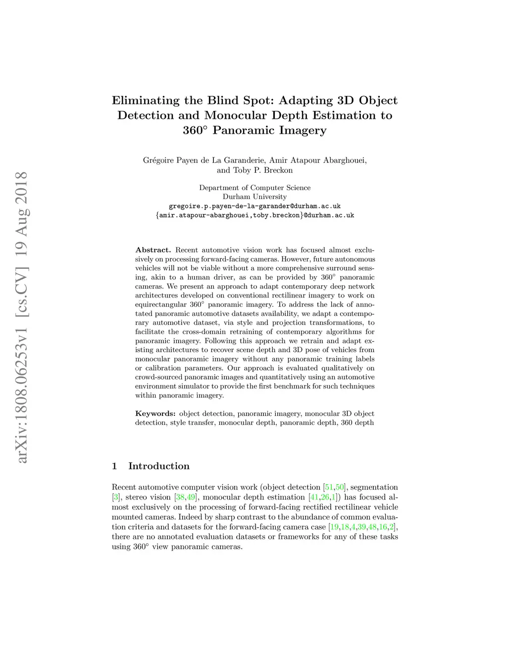 Recent automotive vision work has focused almost exclusively on processing forward-facing cameras. However, future autonomous vehicles will not be viable without a more comprehensive surround sensing, akin to a human driver, as can be provided by 360{\deg} panoramic cameras. We present an approach to adapt contemporary deep network architectures developed on conventional rectilinear imagery to work on equirectangular 360{\deg} panoramic imagery. To address the lack of annotated panoramic automotive datasets availability, we adapt a contemporary automotive dataset, via style and projection transformations, to facilitate the cross-domain retraining of contemporary algorithms for panoramic imagery. Following this approach we retrain and adapt existing architectures to recover scene depth and 3D pose of vehicles from monocular panoramic imagery without any panoramic training labels or calibration parameters. Our approach is evaluated qualitatively on crowd-sourced panoramic images and quantitatively using an automotive environment simulator to provide the first benchmark for such techniques within panoramic imagery.
