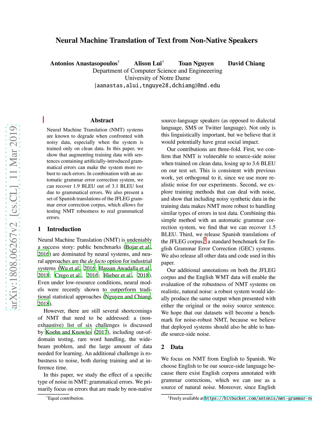 Neural Machine Translation (NMT) systems are known to degrade when confronted with noisy data, especially when the system is trained only on clean data. In this paper, we show that augmenting training data with sentences containing artificially-introduced grammatical errors can make the system more robust to such errors. In combination with an automatic grammar error correction system, we can recover 1.5 BLEU out of 2.4 BLEU lost due to grammatical errors. We also present a set of Spanish translations of the JFLEG grammar error correction corpus, which allows for testing NMT robustness to real grammatical errors.
