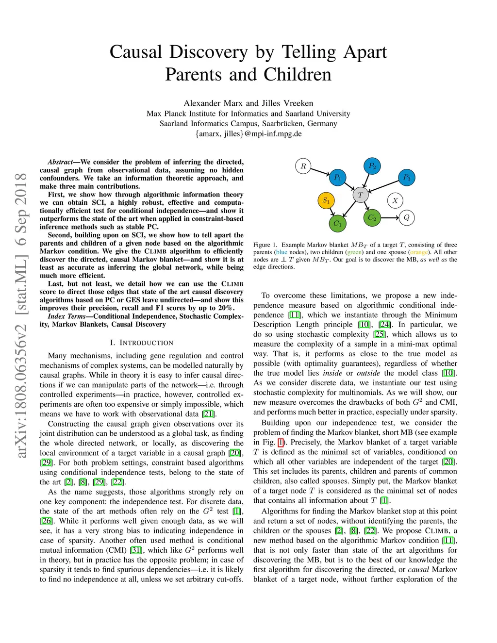 We consider the problem of inferring the directed, causal graph from observational data, assuming no hidden confounders. We take an information theoretic approach, and make three main contributions. First, we show how through algorithmic information theory we can obtain SCI, a highly robust, effective and computationally efficient test for conditional independence---and show it outperforms the state of the art when applied in constraint-based inference methods such as stable PC. Second, building upon on SCI, we show how to tell apart the parents and children of a given node based on the algorithmic Markov condition. We give the Climb algorithm to efficiently discover the directed, causal Markov blanket---and show it is at least as accurate as inferring the global network, while being much more efficient. Last, but not least, we detail how we can use the Climb score to direct those edges that state of the art causal discovery algorithms based on PC or GES leave undirected---and show this improves their precision, recall and F1 scores by up to 20%.