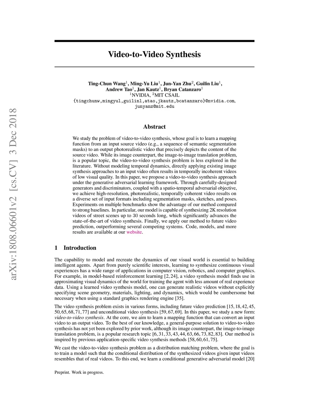 We study the problem of video-to-video synthesis, whose goal is to learn a mapping function from an input source video (e.g., a sequence of semantic segmentation masks) to an output photorealistic video that precisely depicts the content of the source video. While its image counterpart, the image-to-image synthesis problem, is a popular topic, the video-to-video synthesis problem is less explored in the literature. Without understanding temporal dynamics, directly applying existing image synthesis approaches to an input video often results in temporally incoherent videos of low visual quality. In this paper, we propose a novel video-to-video synthesis approach under the generative adversarial learning framework. Through carefully-designed generator and discriminator architectures, coupled with a spatio-temporal adversarial objective, we achieve high-resolution, photorealistic, temporally coherent video results on a diverse set of input formats including segmentation masks, sketches, and poses. Experiments on multiple benchmarks show the advantage of our method compared to strong baselines. In particular, our model is capable of synthesizing 2K resolution videos of street scenes up to 30 seconds long, which significantly advances the state-of-the-art of video synthesis. Finally, we apply our approach to future video prediction, outperforming several state-of-the-art competing systems.