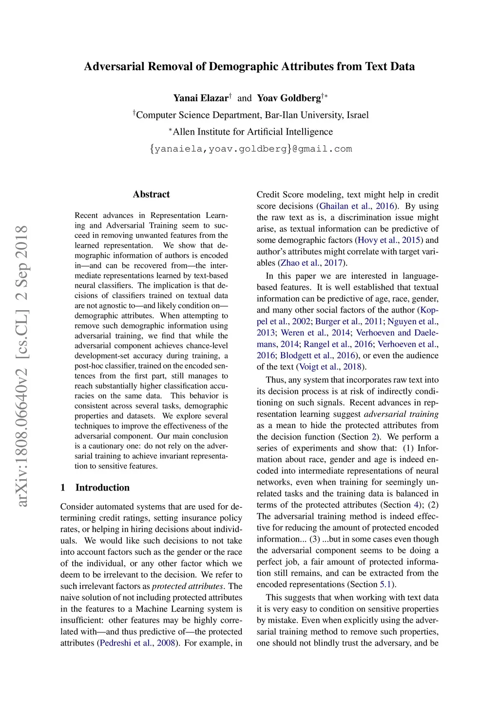 Recent advances in Representation Learning and Adversarial Training seem to succeed in removing unwanted features from the learned representation. We show that demographic information of authors is encoded in -- and can be recovered from -- the intermediate representations learned by text-based neural classifiers. The implication is that decisions of classifiers trained on textual data are not agnostic to -- and likely condition on -- demographic attributes. When attempting to remove such demographic information using adversarial training, we find that while the adversarial component achieves chance-level development-set accuracy during training, a post-hoc classifier, trained on the encoded sentences from the first part, still manages to reach substantially higher classification accuracies on the same data. This behavior is consistent across several tasks, demographic properties and datasets. We explore several techniques to improve the effectiveness of the adversarial component. Our main conclusion is a cautionary one: do not rely on the adversarial training to achieve invariant representation to sensitive features.