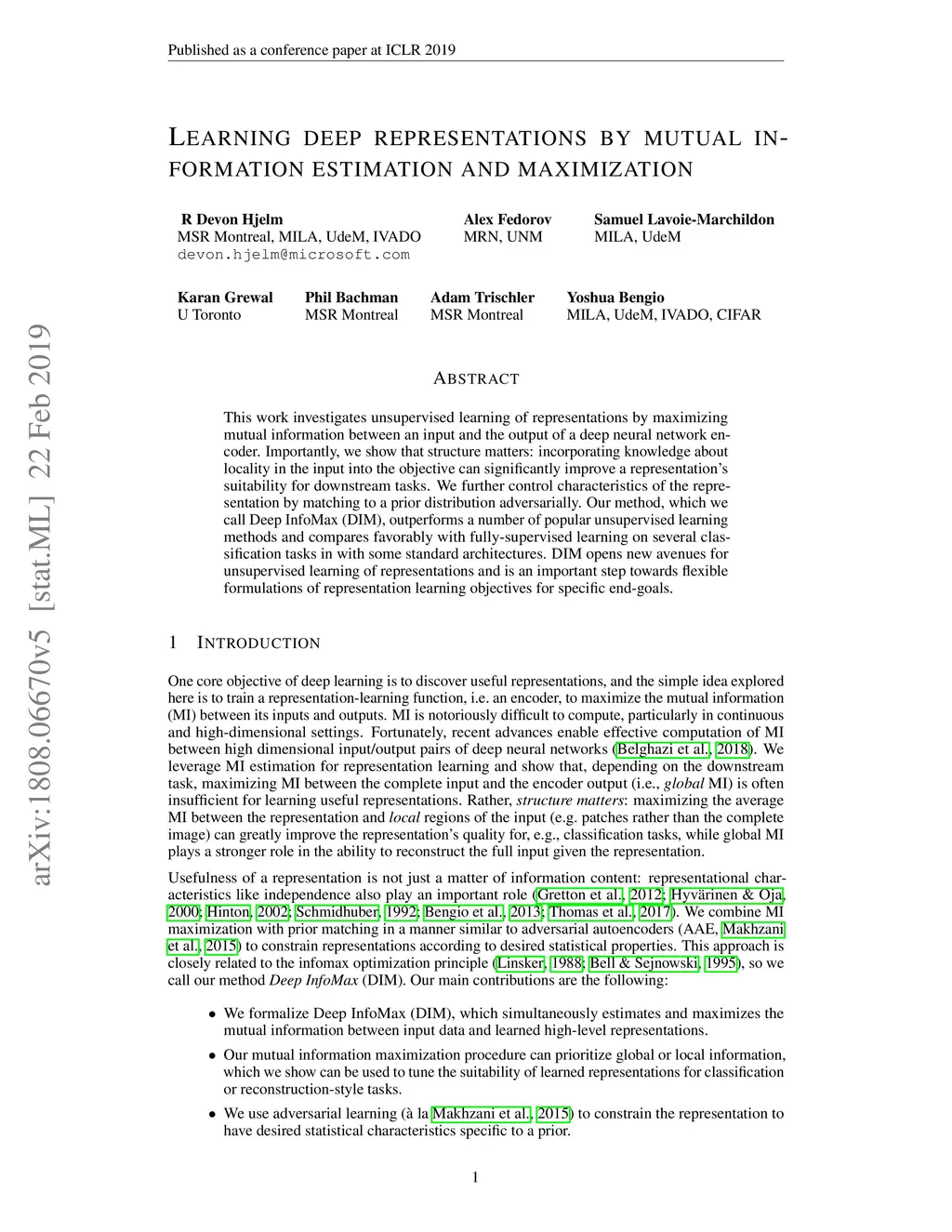 In this work, we perform unsupervised learning of representations by maximizing mutual information between an input and the output of a deep neural network encoder. Importantly, we show that structure matters: incorporating knowledge about locality of the input to the objective can greatly influence a representation's suitability for downstream tasks. We further control characteristics of the representation by matching to a prior distribution adversarially. Our method, which we call Deep InfoMax (DIM), outperforms a number of popular unsupervised learning methods and competes with fully-supervised learning on several classification tasks. DIM opens new avenues for unsupervised learning of representations and is an important step towards flexible formulations of representation-learning objectives for specific end-goals.
