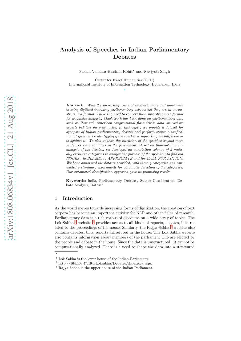 With the increasing usage of the internet, more and more data is being digitized including parliamentary debates but they are in an unstructured format. There is a need to convert them into a structured format for linguistic analysis. Much work has been done on parliamentary data such as Hansard, American congressional floor-debate data on various aspects but less on pragmatics. In this paper, we provide a dataset for the synopsis of Indian parliamentary debates and perform stance classification of speeches i.e identifying if the speaker is supporting the bill/issue or against it. We also analyze the intention of the speeches beyond mere sentences i.e pragmatics in the parliament. Based on thorough manual analysis of the debates, we developed an annotation scheme of 4 mutually exclusive categories to analyze the purpose of the speeches: to find out ISSUES, to BLAME, to APPRECIATE and for CALL FOR ACTION. We have annotated the dataset provided, with these 4 categories and conducted preliminary experiments for automatic detection of the categories. Our automated classification approach gave us promising results.