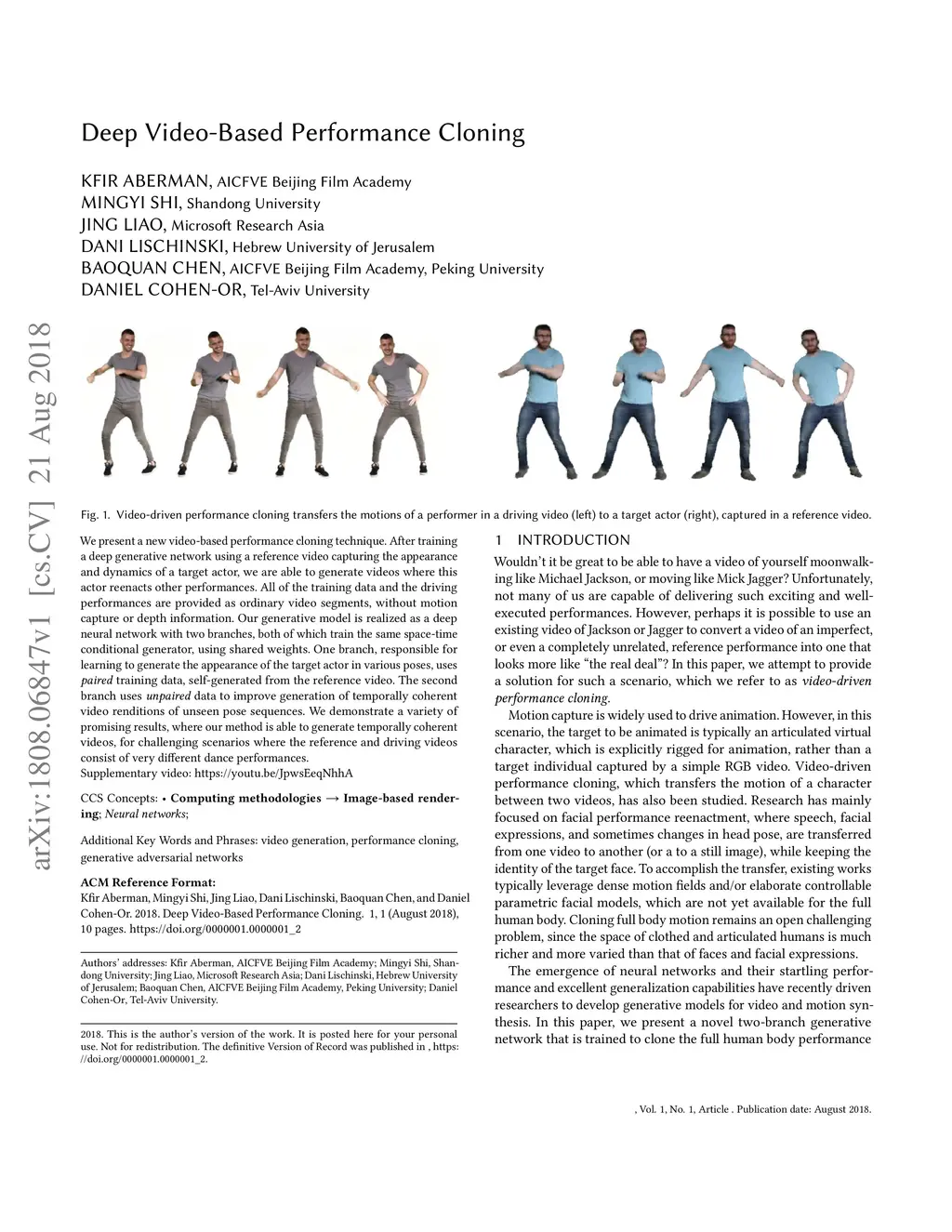 We present a new video-based performance cloning technique. After training a deep generative network using a reference video capturing the appearance and dynamics of a target actor, we are able to generate videos where this actor reenacts other performances. All of the training data and the driving performances are provided as ordinary video segments, without motion capture or depth information. Our generative model is realized as a deep neural network with two branches, both of which train the same space-time conditional generator, using shared weights. One branch, responsible for learning to generate the appearance of the target actor in various poses, uses \emph{paired} training data, self-generated from the reference video. The second branch uses unpaired data to improve generation of temporally coherent video renditions of unseen pose sequences. We demonstrate a variety of promising results, where our method is able to generate temporally coherent videos, for challenging scenarios where the reference and driving videos consist of very different dance performances. Supplementary video: https://youtu.be/JpwsEeqNhhA.