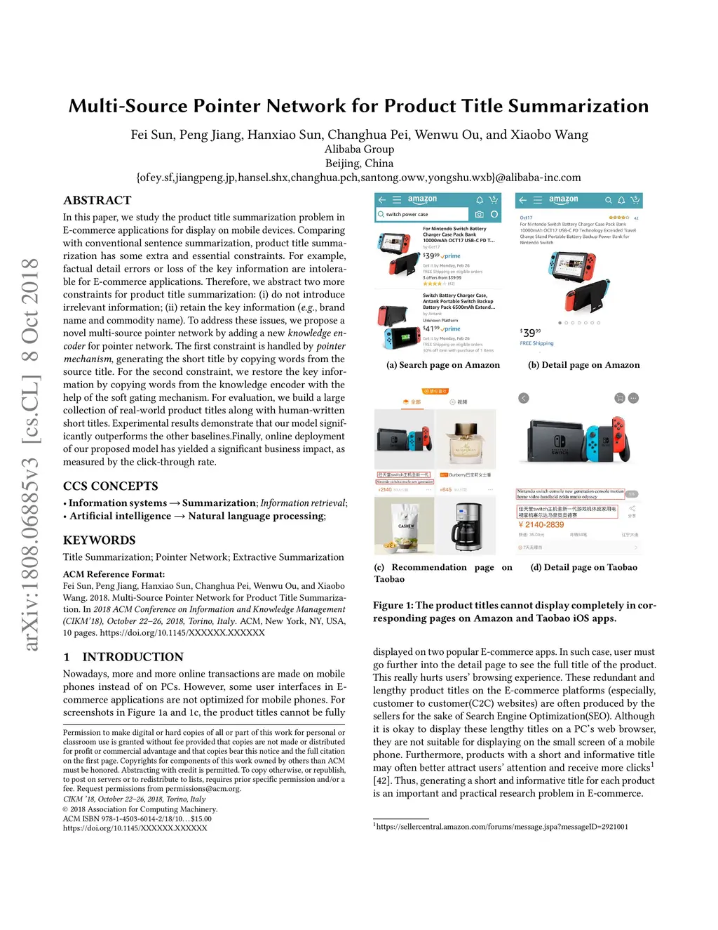 In this paper, we study the product title summarization problem in E-commerce applications for display on mobile devices. Comparing with conventional sentence summarization, product title summarization has some extra and essential constraints. For example, factual errors or loss of the key information are intolerable for E-commerce applications. Therefore, we abstract two more constraints for product title summarization: (i) do not introduce irrelevant information; (ii) retain the key information (e.g., brand name and commodity name). To address these issues, we propose a novel multi-source pointer network by adding a new knowledge encoder for pointer network. The first constraint is handled by pointer mechanism. For the second constraint, we restore the key information by copying words from the knowledge encoder with the help of the soft gating mechanism. For evaluation, we build a large collection of real-world product titles along with human-written short titles. Experimental results demonstrate that our model significantly outperforms the other baselines. Finally, online deployment of our proposed model has yielded a significant business impact, as measured by the click-through rate.
