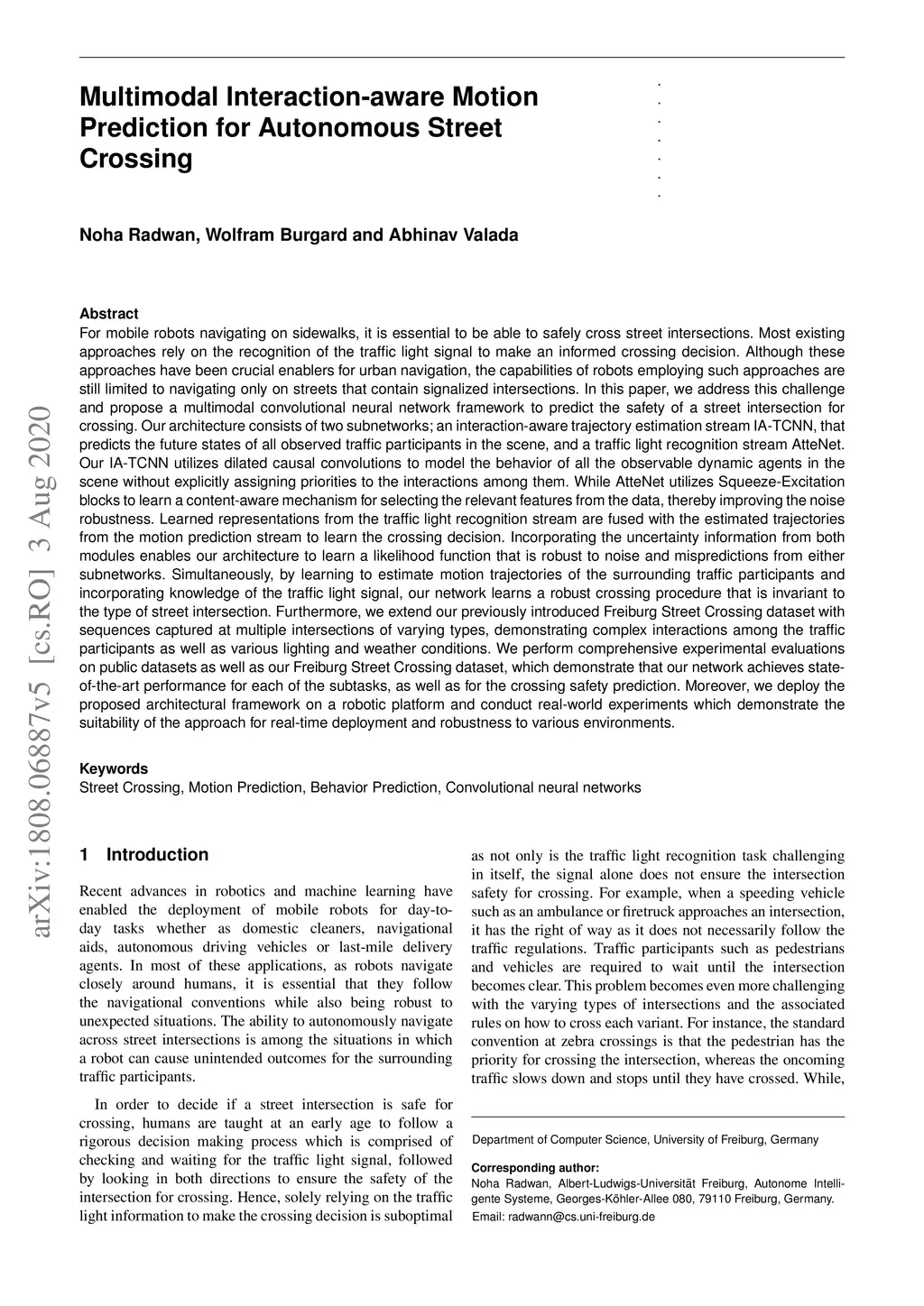 For mobile robots navigating on sidewalks, it is essential to be able to safely cross street intersections. Most existing approaches rely on the recognition of the traffic light signal to make an informed crossing decision. Although these approaches have been crucial enablers for urban navigation, the capabilities of robots employing such approaches are still limited to navigating only on streets containing signalized intersections. In this paper, we address this challenge and propose a multimodal convolutional neural network framework to predict the safety of a street intersection for crossing. Our architecture consists of two subnetworks; an interaction-aware trajectory estimation stream IA-TCNN, that predicts the future states of all observed traffic participants in the scene, and a traffic light recognition stream AtteNet. Our IA-TCNN utilizes dilated causal convolutions to model the behavior of the observable dynamic agents in the scene without explicitly assigning priorities to the interactions among them. While AtteNet utilizes Squeeze-Excitation blocks to learn a content-aware mechanism for selecting the relevant features from the data, thereby improving the noise robustness. Learned representations from the traffic light recognition stream are fused with the estimated trajectories from the motion prediction stream to learn the crossing decision. Furthermore, we extend our previously introduced Freiburg Street Crossing dataset with sequences captured at different types of intersections, demonstrating complex interactions among the traffic participants. Extensive experimental evaluations on public benchmark datasets and our proposed dataset demonstrate that our network achieves state-of-the-art performance for each of the subtasks, as well as for the crossing safety prediction.