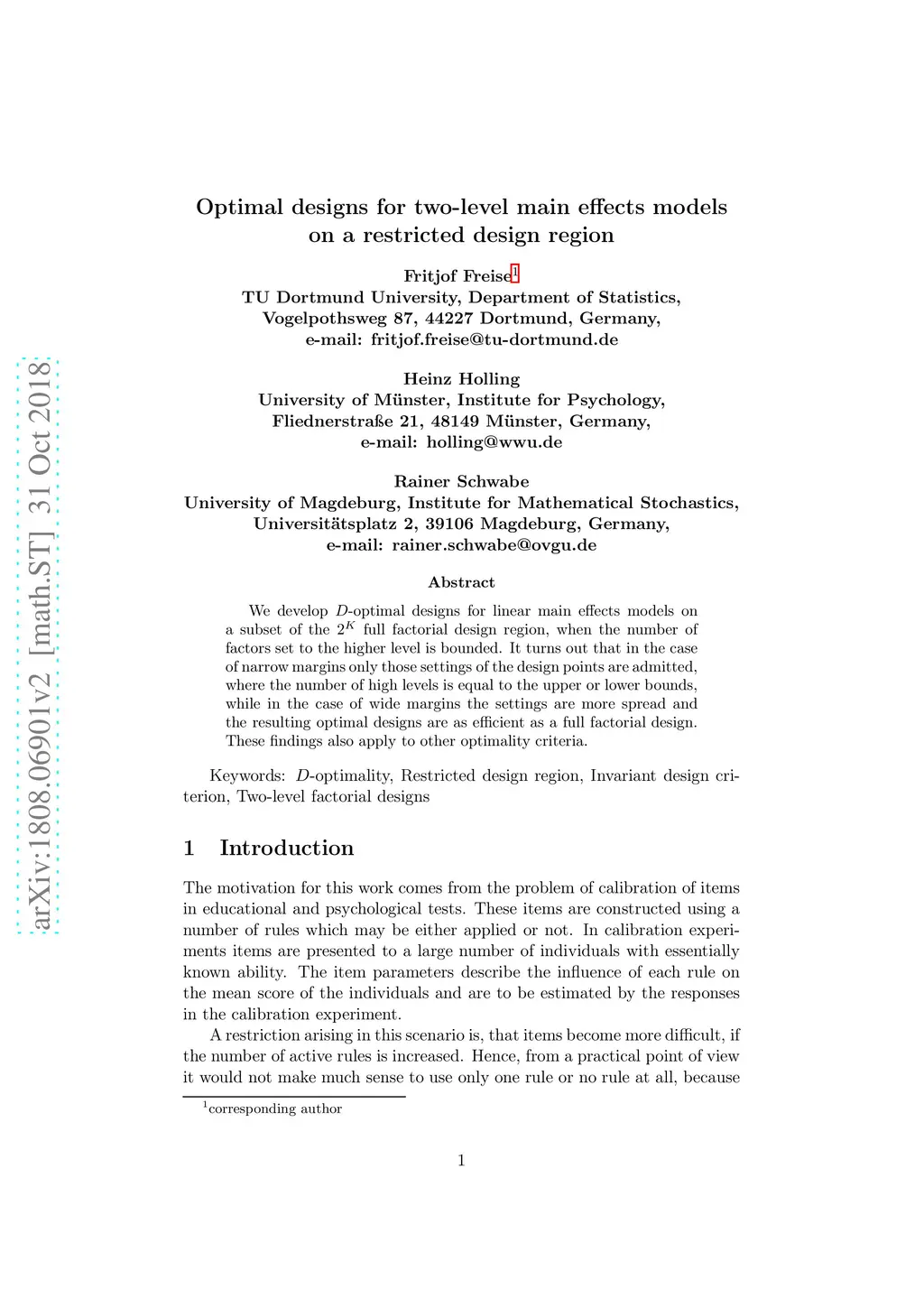 We develop -optimal designs for linear main effects models on a subset of the full factorial design region, when the number of factors set to the higher level is bounded. It turns out that in the case of narrow margins only those settings of the design points are admitted, where the number of high levels is equal to the upper or lower bounds, while in the case of wide margins the settings are more spread and the resulting optimal designs are as efficient as a full factorial design. These findings also apply to other optimality criteria.