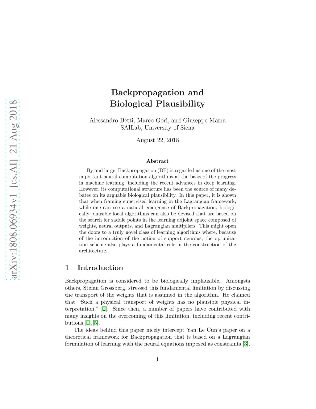By and large, Backpropagation (BP) is regarded as one of the most important neural computation algorithms at the basis of the progress in machine learning, including the recent advances in deep learning. However, its computational structure has been the source of many debates on its arguable biological plausibility. In this paper, it is shown that when framing supervised learning in the Lagrangian framework, while one can see a natural emergence of Backpropagation, biologically plausible local algorithms can also be devised that are based on the search for saddle points in the learning adjoint space composed of weights, neural outputs, and Lagrangian multipliers. This might open the doors to a truly novel class of learning algorithms where, because of the introduction of the notion of support neurons, the optimization scheme also plays a fundamental role in the construction of the architecture.