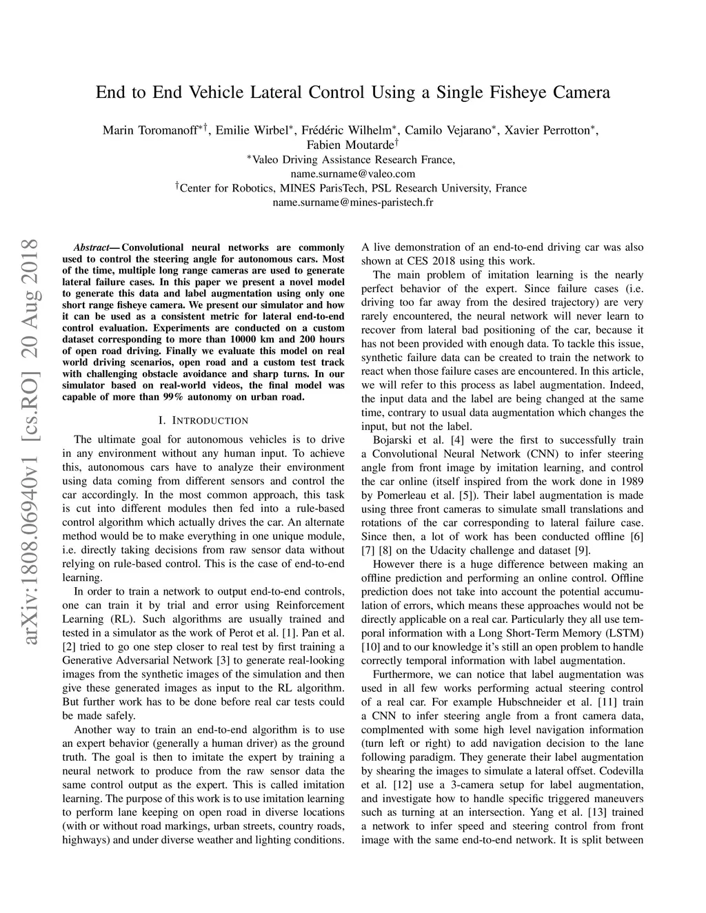 Convolutional neural networks are commonly used to control the steering angle for autonomous cars. Most of the time, multiple long range cameras are used to generate lateral failure cases. In this paper we present a novel model to generate this data and label augmentation using only one short range fisheye camera. We present our simulator and how it can be used as a consistent metric for lateral end-to-end control evaluation. Experiments are conducted on a custom dataset corresponding to more than 10000 km and 200 hours of open road driving. Finally we evaluate this model on real world driving scenarios, open road and a custom test track with challenging obstacle avoidance and sharp turns. In our simulator based on real-world videos, the final model was capable of more than 99% autonomy on urban road