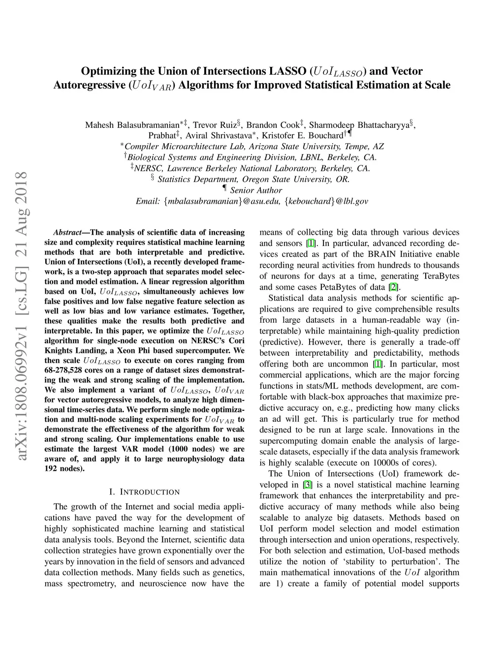 The analysis of scientific data of increasing size and complexity requires statistical machine learning methods that are both interpretable and predictive. Union of Intersections (UoI), a recently developed framework, is a two-step approach that separates model selection and model estimation. A linear regression algorithm based on UoI, , simultaneously achieves low false positives and low false negative feature selection as well as low bias and low variance estimates. Together, these qualities make the results both predictive and interpretable. In this paper, we optimize the algorithm for single-node execution on NERSC's Cori Knights Landing, a Xeon Phi based supercomputer. We then scale to execute on cores ranging from 68-278,528 cores on a range of dataset sizes demonstrating the weak and strong scaling of the implementation. We also implement a variant of , for vector autoregressive models, to analyze high dimensional time-series data. We perform single node optimization and multi-node scaling experiments for to demonstrate the effectiveness of the algorithm for weak and strong scaling. Our implementations enable to use estimate the largest VAR model (1000 nodes) we are aware of, and apply it to large neurophysiology data 192 nodes).